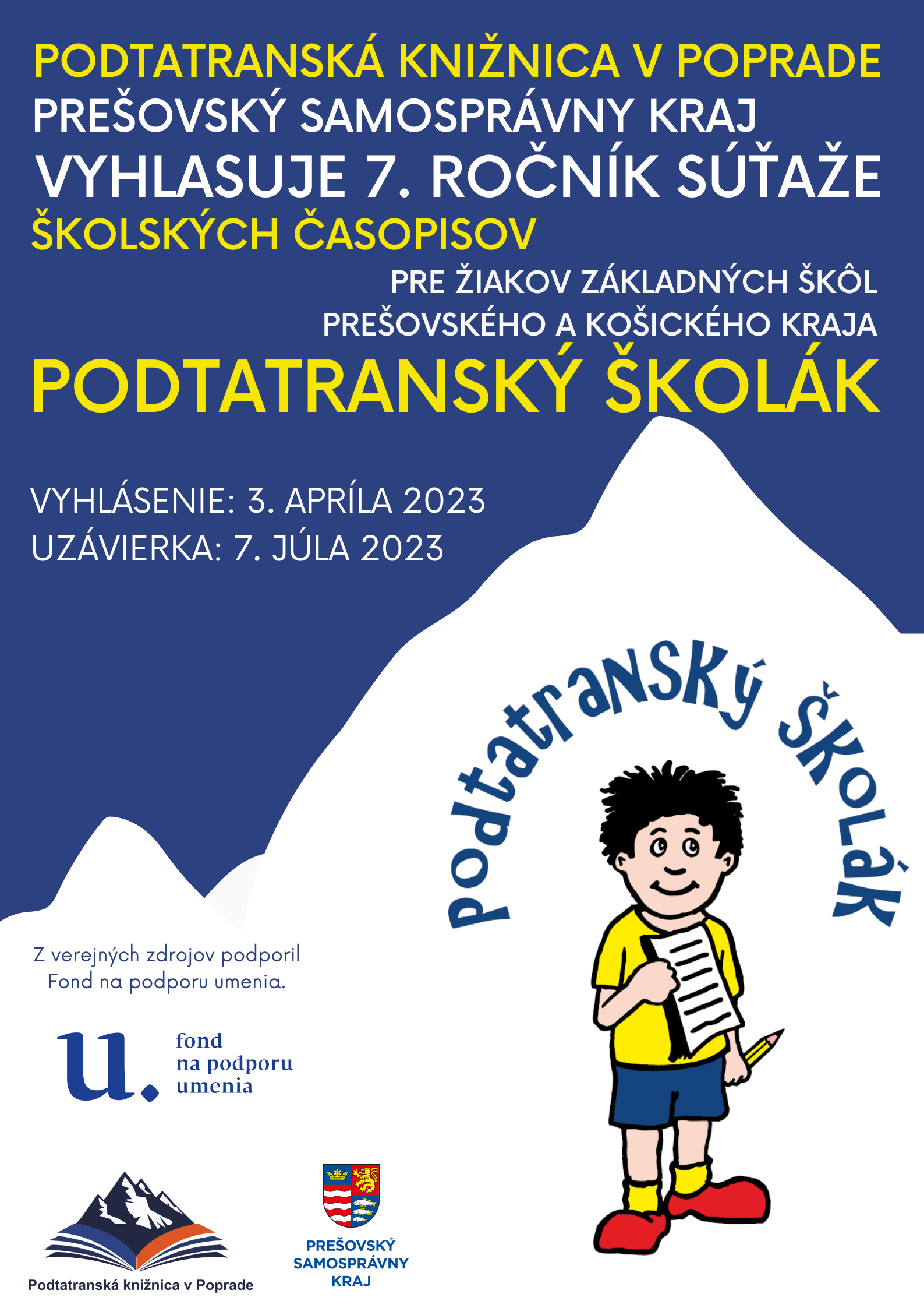 Aj tento rok Podtatranská knižnica v Poprade vyhlasuje súťaž školských časopisov základných škôl Prešovského a Košického samosprávneho kraja. Cieľom súťaže je podporiť a podchytiť začínajúce školské časopisy a zvýšiť odbornú úroveň už vydávaných časopisov. Propozície súťaže nájdete v texte. Tešíme sa na všetky školské časopisy, ktoré prihlásite do súťaže. Projekt z verejných zdrojov podporil Fond na podporu umenia. Prihlášku do súťaže nájdete na webovej stránke Podtatranskej knižnice v Poprad