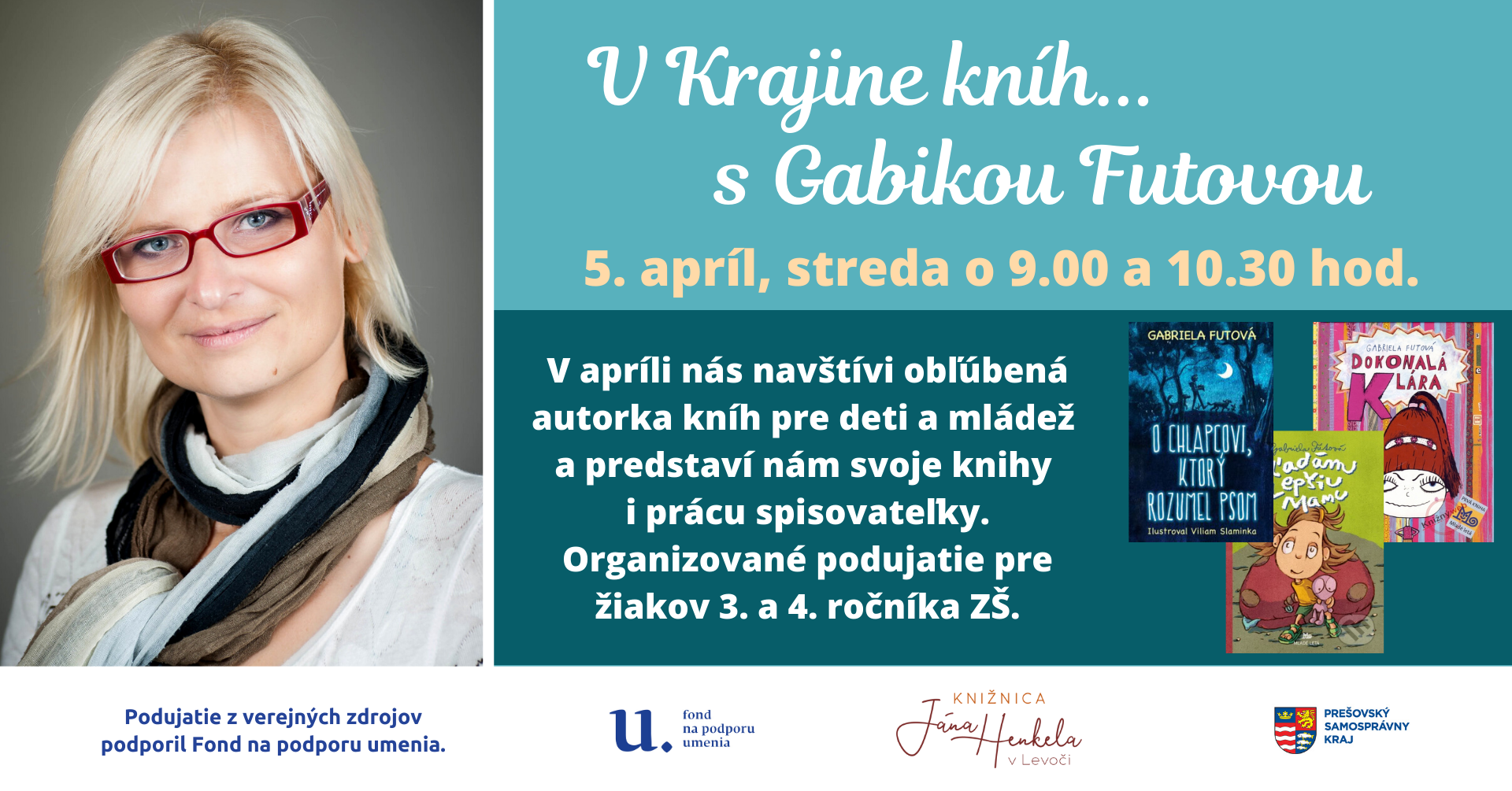 V rámci projektu Krajina kníh si do knižnice na stretnutia s deťmi a mládežou pozývame zaujímavých slovenských tvorcov kníh. V apríli prijala pozvanie na besedu spisovateľka Gabriela Futová, ktorá deťom predstaví svoju tvorbu a porozpráva a práci spisovateľky.