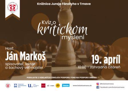 V súčasnej dobe preplnenej informáciami, ale aj množstvom dezinformácií, je nutné, aby sme vedeli aj kriticky uvažovať a prijímané informácie triediť. Kritické myslenie je niečo ako teória, stratégia, metóda či proces ako uchopiť poznávanie. Najmä študenti majú častokrát problémy so spájaním informácii, dedukciou, argumentáciou a tvorbou záverov. Prednášateľom bude spisovateľ, lektor a šachový veľmajster Ján Markoš.