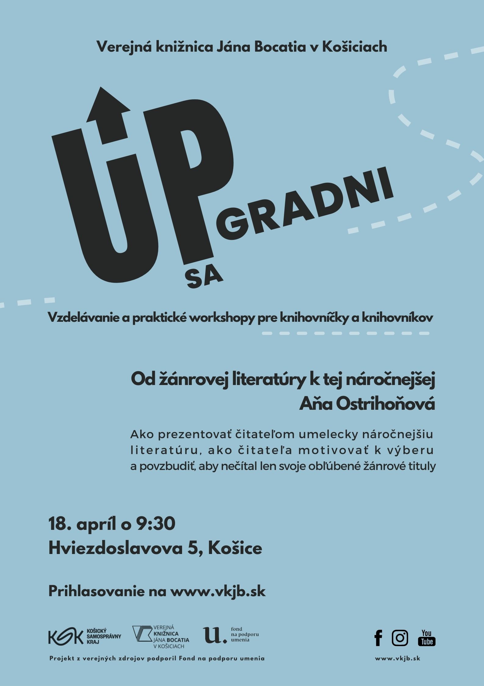 Upgradni sa a zvýš svoje profesijné a osobnostné kompetencie. Verejná knižnica Jána Bocatia v Košiciach pozýva knihovníčky a knihovníkov na odborné vzdelávanie, ktoré pripravila. V rámci projektu Upgradni sa, si kladie za cieľ prispieť k rozvoju ich odborných znalostí tak, aby dokázali v kvalitnejšom pracovnom prostredí poskytovať verejnosti lepšie služby.
