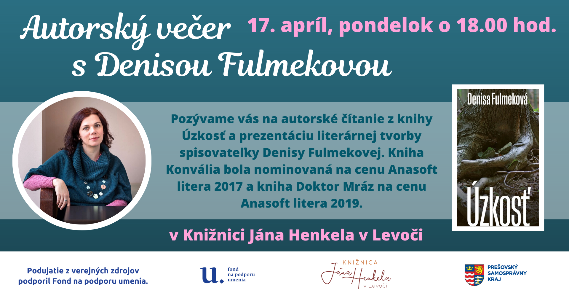 V rámci projektu Autorský večer s... sme pre vás pripravili sériu stretnutí so zaujímavými slovenskými autormi. V apríli nás navštívi spisovateľka Denisa Fulmeková, ktorá nám predstaví svoju tvorbu. Beseda bude spojená s autorským čítaním z knihy Úzkosť.