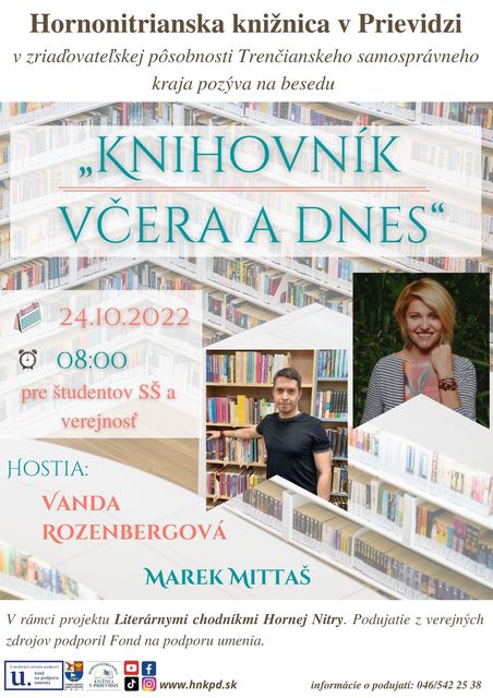 Diskusia s dvomi spisovateľmi Vandou Rozenbergovou a Marekom Mittašom – ktorí boli a sú zamestnancami Hornonitrianskej knižnice v Prievidzi. Spisovatelia budú rozprávať o knižniciach, zaspomínajú si na svoje čitateľské a spisovateľské začiatky, porovnajú prácu v knižnici - aká je teraz a aká bola v minulosti, ako sa zmenila práca knihovníka za posledné roky. Podujatie je vhodné pre verejnosť a študentov stredných škôl.