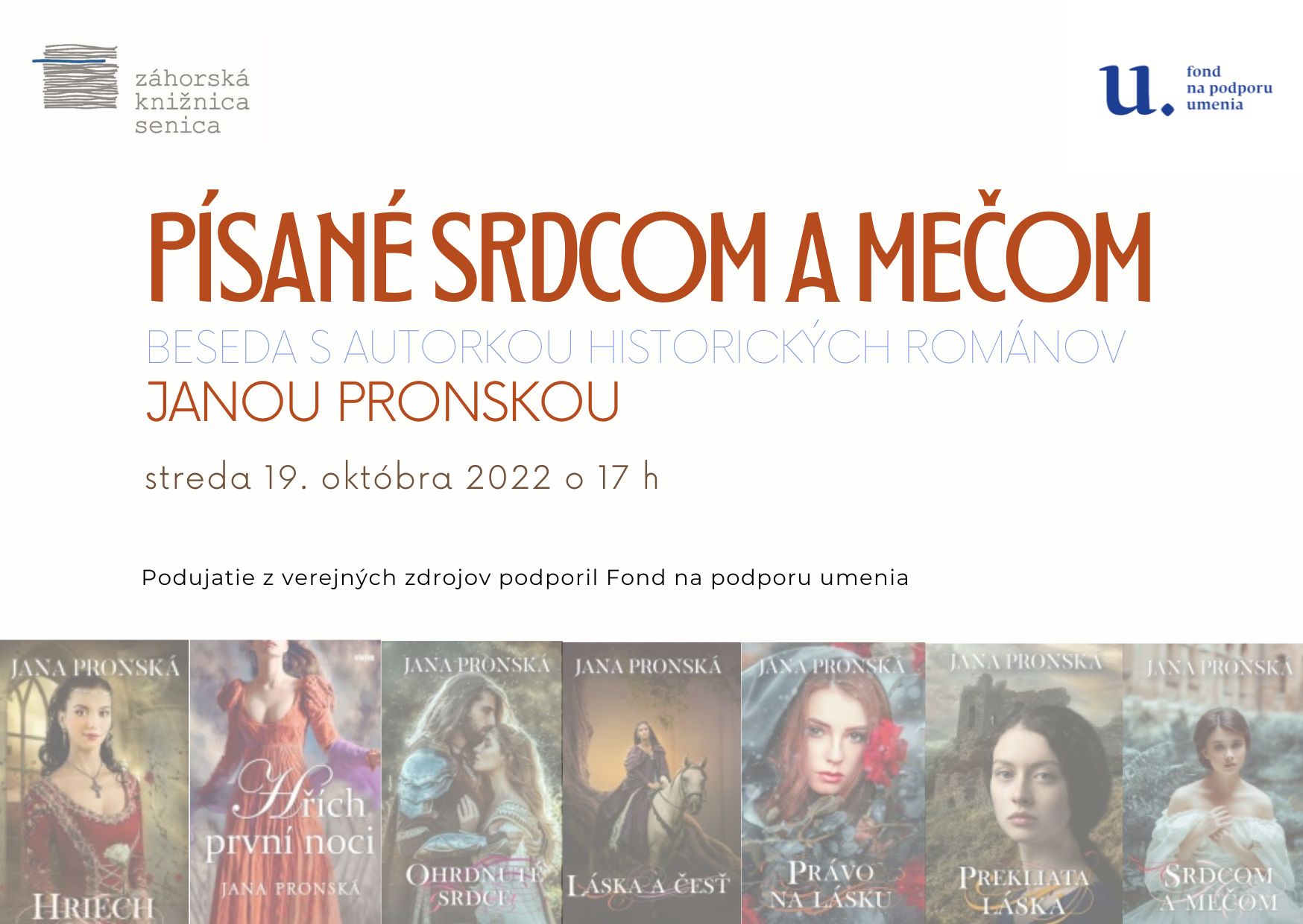 Pozývame na besedu s Janou Pronskou, autorkou historických románov. Stretnutie sa uskutoční v stredu 19. októbra 2022 o 17 h.
