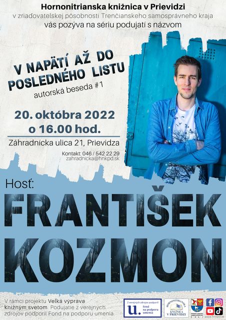 Červ, Vlk, Volavka alebo Kukučka? Nielen tieto zvieratá, ale aj mnohé ďalšie majú čestné miesto na obálkach kníh mladého autora kriminálnych príbehov, Františka Kozmona. Okrem zaujímavého rozprávania o autorovej tvorbe bude príležitosť podebatovať o všetkom, čo návštevníkov bude zaujímať.