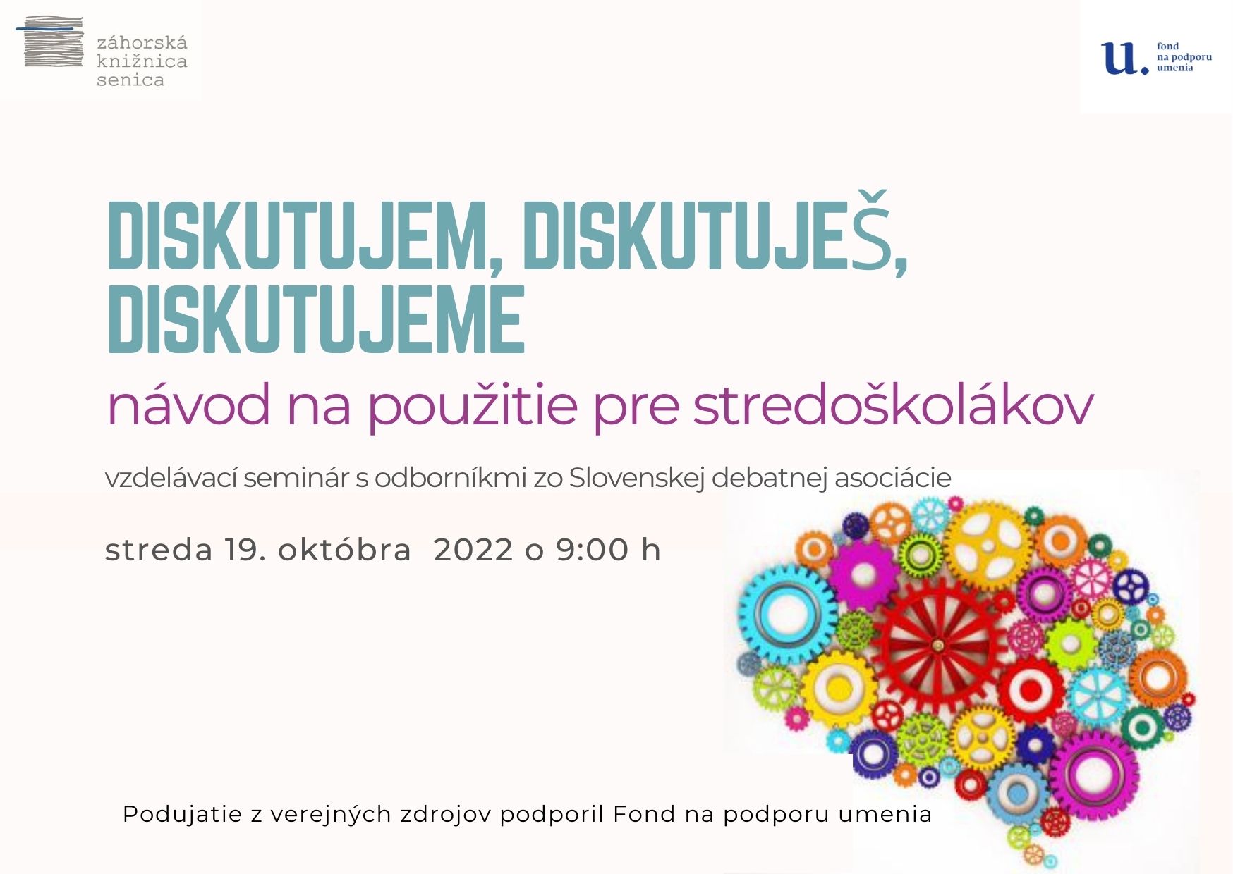 Debatné podujatie pre stredoškolákov s lektormi Slovenskej debatnej asociácie, ktoré sa uskutoční v stredu 19. 10. 2022 o 9 h.