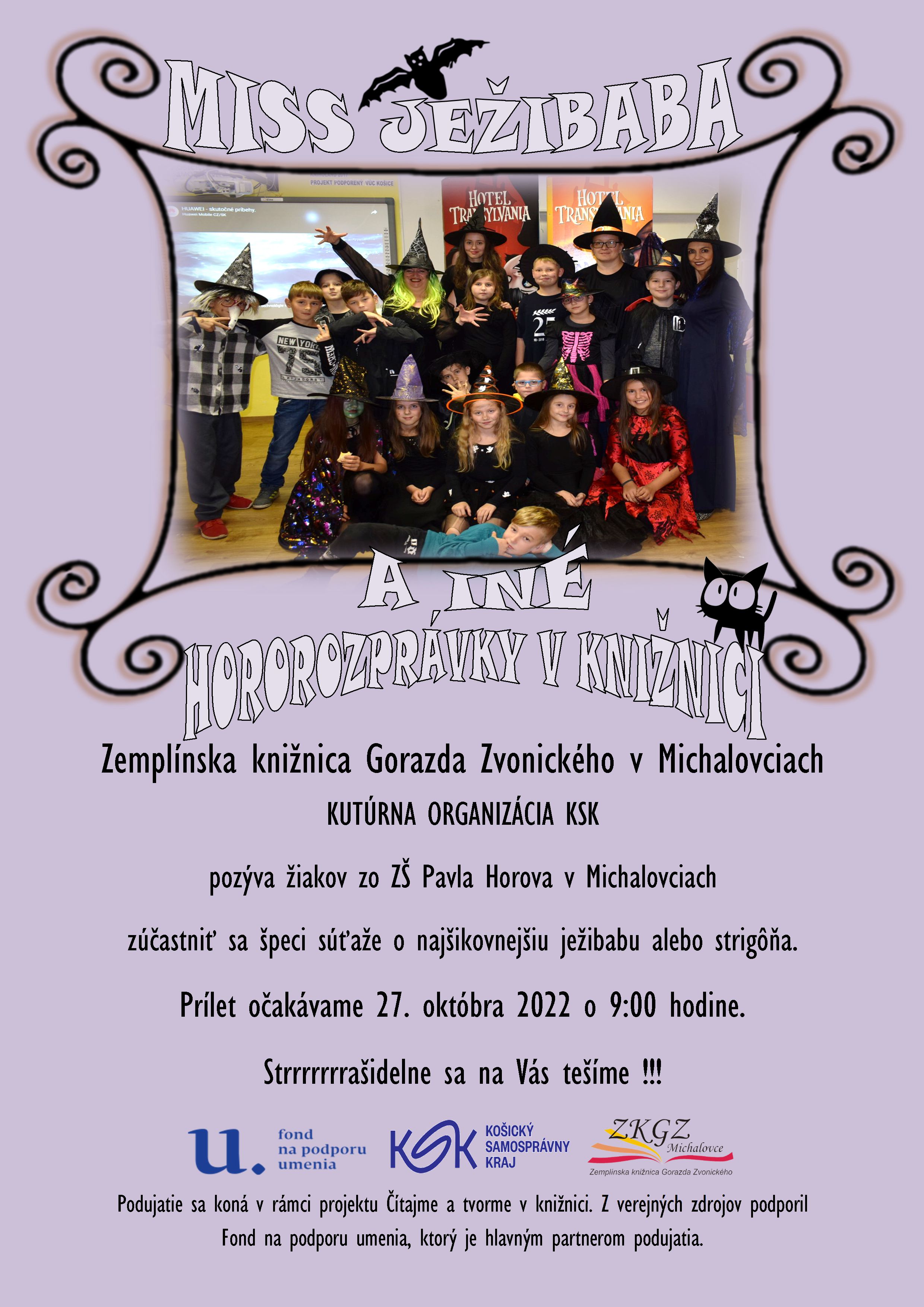 Interaktívne podujatie zamerané na propagáciu a zatraktívnenie čítania literatúry určenej deťom. Obsahuje 4 druhy aktivít: zážitkové čítanie "strašidelných" príbehov, súťaž Miss ježibaba, ples a ilustrovanie "strašidelných" príbehov.