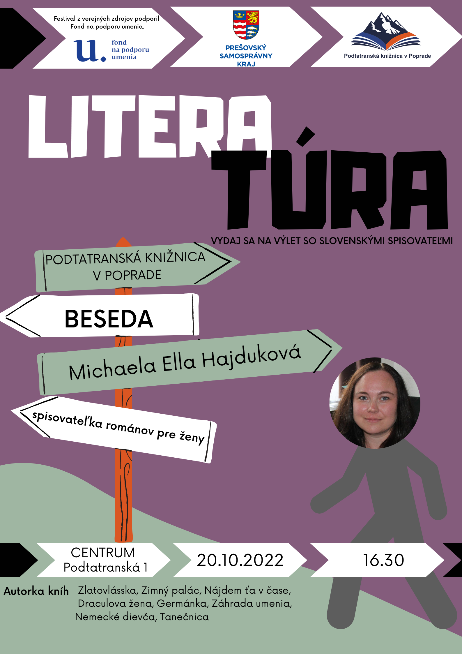 Pozývame Vás na ďalšiu zo série besied v rámci projektu LiteraTÚRA. Tentokrát sa stretneme s Michaelou Ellou Hajdukovou, autorkou románov pre ženy. Príbehy, ktoré píše, sú charakteristické tým, že sa odohrávajú v súčasnosti, zároveň sčasti v minulosti a tiež vo svete medzi nebom a zemou. Tešíme sa na Michaela Ella Hajduková - autorka v Centre Podtatranskej knižnice v Poprade (Podtatranská 1) už 20.10.2022 o 16.30. Podujatie z verejných zdrojov podporil Fond na podporu umenia.