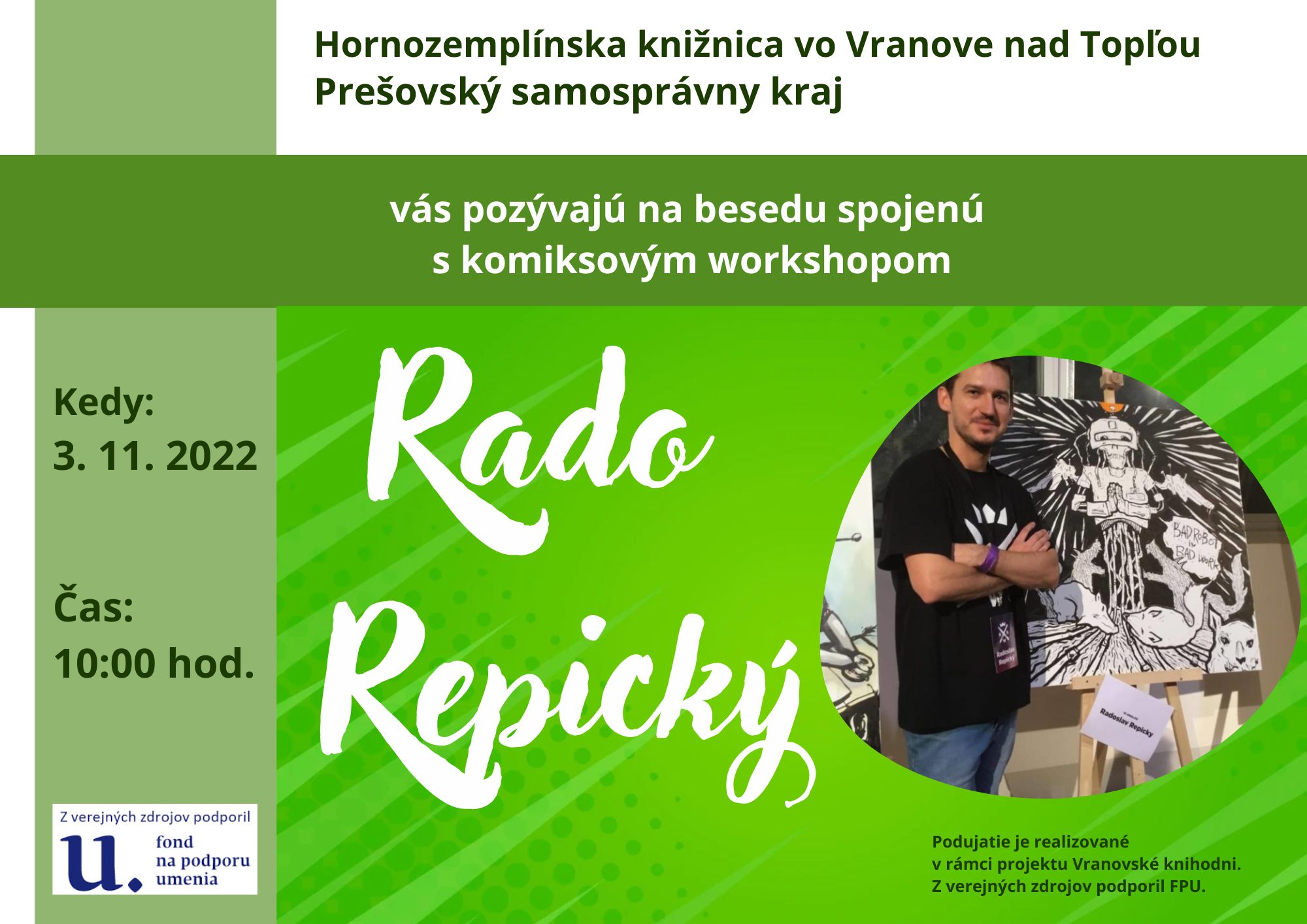 Hornozemplínska knižnica pozýva na stretnutie s ilustrátorom Radom Repickým, ktoré sa uskutoční 3. novembra 2022 o 10.00 h. Podujatie z verejných zdrojov podporil Fond na podporu umenia.