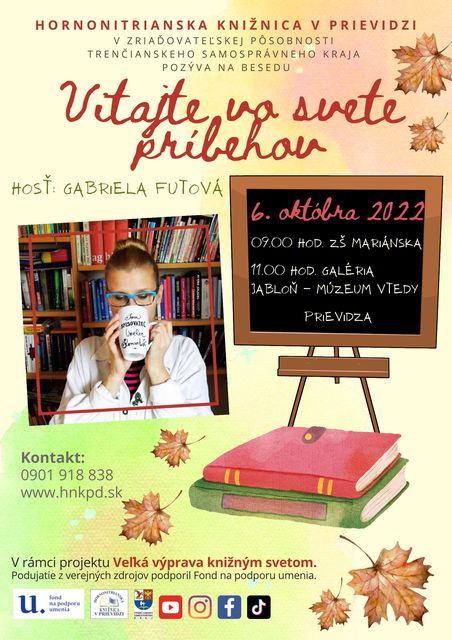 V rámci "Knihobrania" navštívi 6. októbra 2022 Hornonitriansku knižnicu v Prievidzi aj skvelá slovenská spisovateľka Gabriela Futová. Najskôr sa prihovorí deťom z 1. stupňa priamo v ZŠ Mariánska, predpoludním sa presunie na naozaj zaujímavé miesto, do "retro" triedy, ktorá sa nachádza v Múzeu Vtedy v Galérii Jabloň. Knihy tak opäť dostanú šancu priblížiť sa priamo k malým čitateľom.