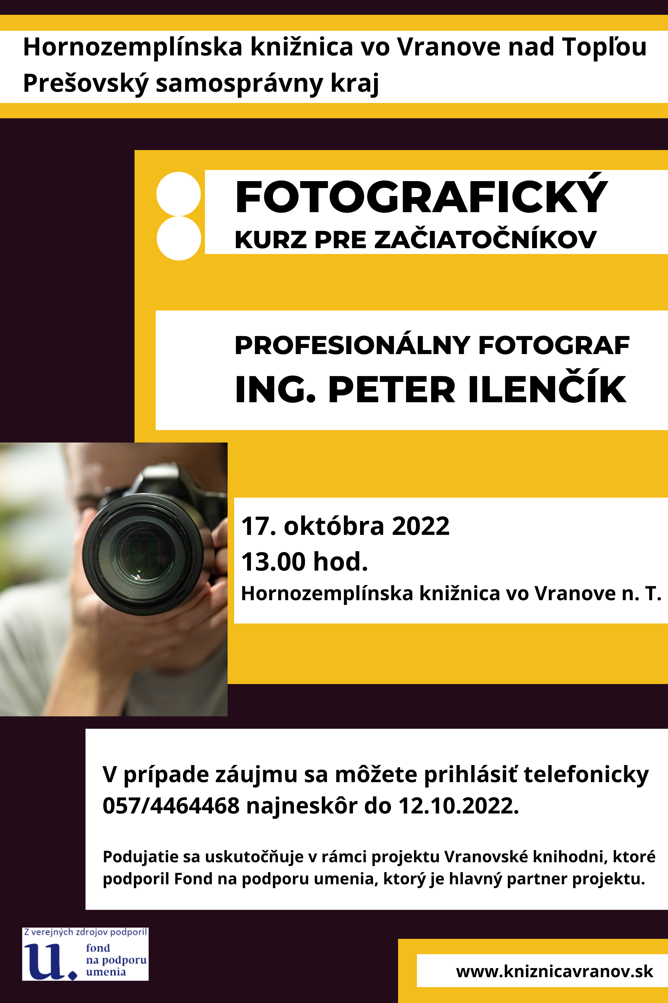 Hornozemplínska knižnica vo Vranove nad Topľou srdečne pozýva na fotografický kurz pre začiatočníkov, ktoré sa uskutoční 17. októbra 2022 o 13.00 hod. s profesionálnym fotografom Ing. Petrom Ilenčíkom. Podujatie z verejných zdrojov podporil Fond na podporu umenia. Tešíme sa na vás.