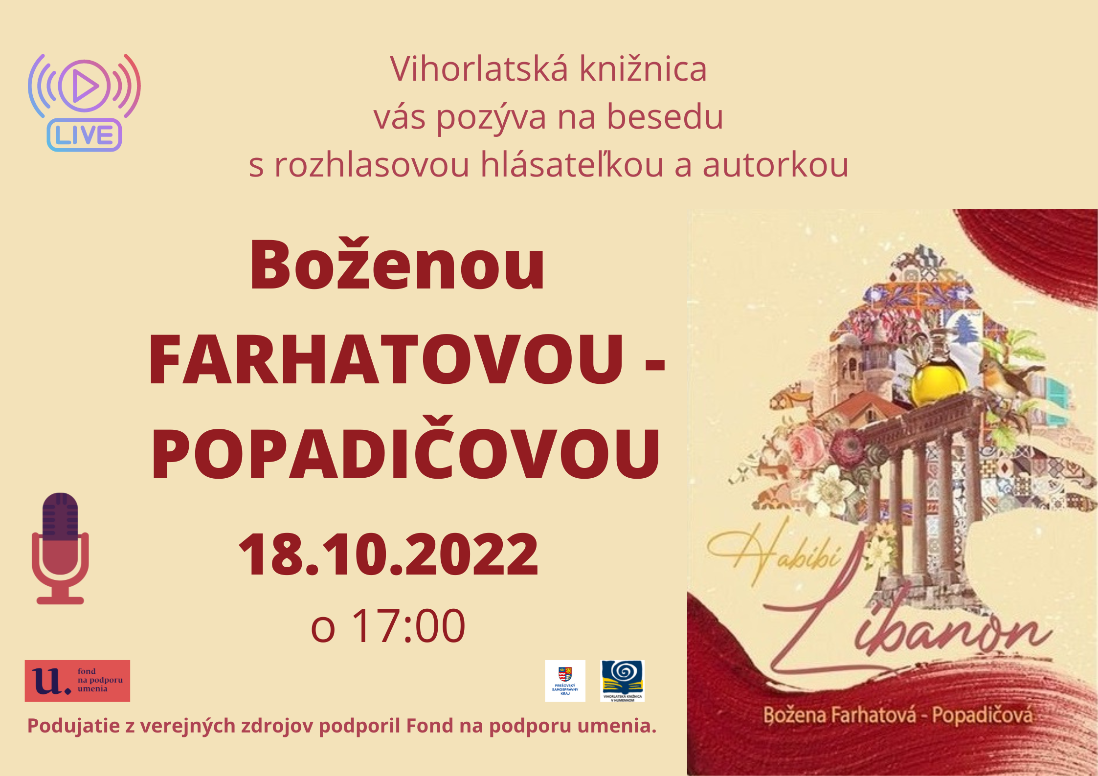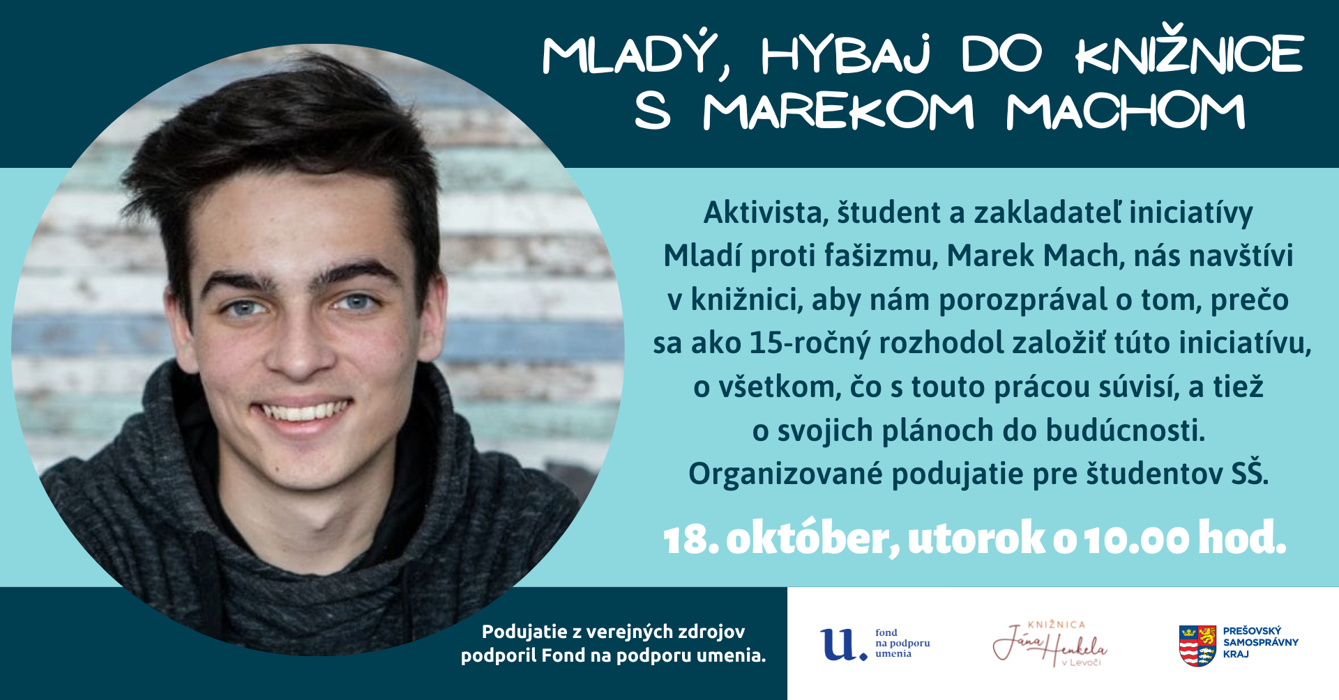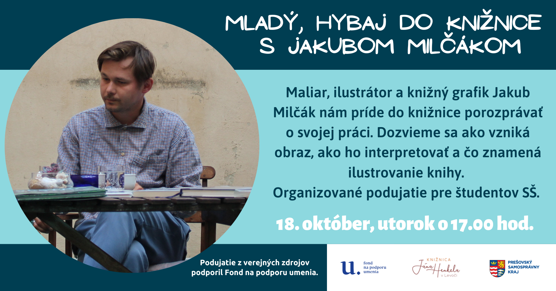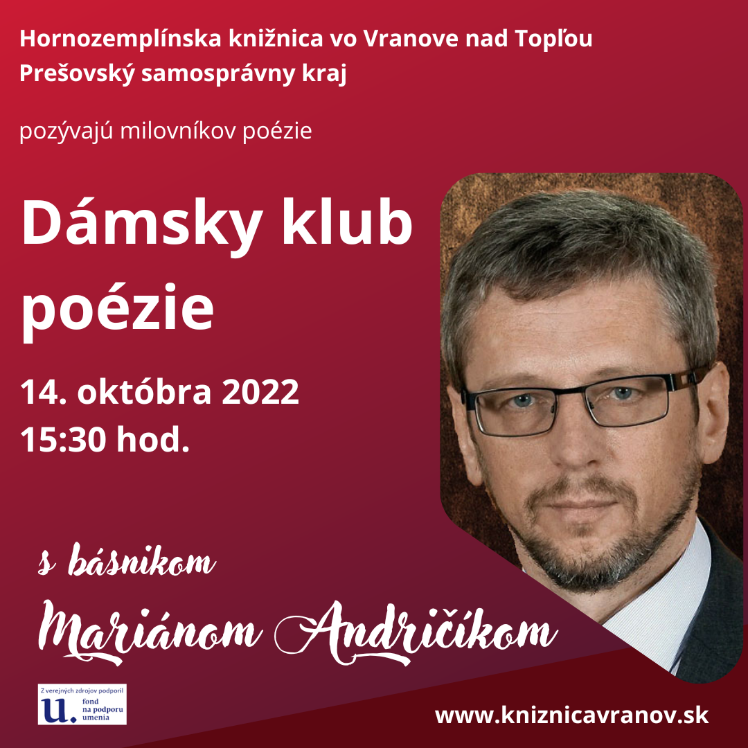 Hornozemplínska knižnica vo Vranove nad Topľou srdečne pozýva milovníkov a fanúšikov poézie do Dámskeho klubu poézie, ktoré sa uskutoční 14. októbra 2022 o 15.30 hod. s básnikom Mariánom Andričíkom. Podujatie z verejných zdrojov podporil Fond na podporu umenia. Tešíme sa na vás.