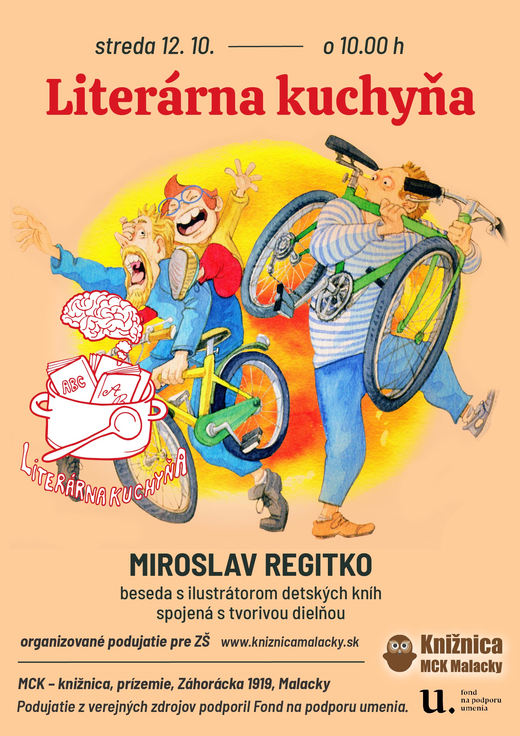 Knižnica MCK Malacky v Literárnej kuchyni namieša druhú jesennú výchovno-vzdelávaciu kašu, ktorá podporuje čitateľskú gramotnosť, čiže trávenie kníh u detí a mládeže a ich záujem o literatúru. Pripravili sme pre žiakov organizované stretnutie s grafikom a ilustrátorom Miroslavom Regitkom. Pod jeho vedením si deti vyskúšajú na vlastnej koži, aké to je, zhmotňovať svoje predstavy o príbehoch na stránkach papiera.