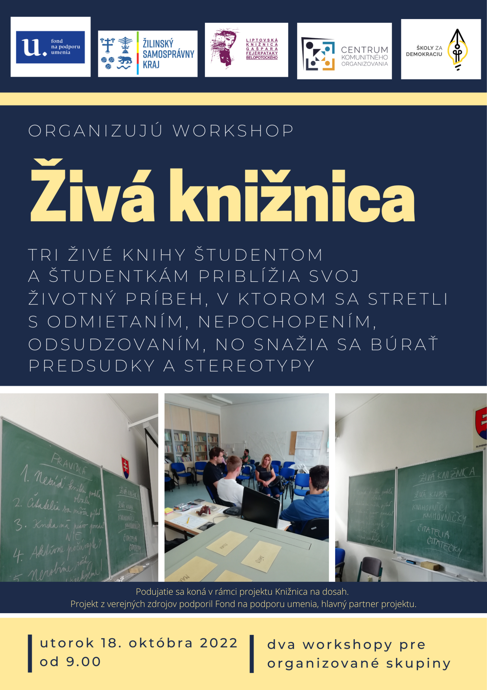 Živá knižnica, dva workshopy pre stredné školy, 18. október 2022 o 9,00 hod. a 10,45 hod.
