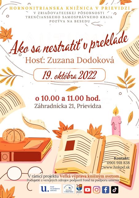 Prekladatelia možno nestoja vo svetle reflektorov spolu s autormi, no sú pre nás veľmi dôležití. Oni nám pomáhajú búrať bariéry - a to nie hocijaké, ale tie jazykové, ktoré častokrát stoja medzi človekom a krásou či poznaním. Kto je teda prekladateľ a čo je jeho úlohou? Čo potrebujete na to, aby ste dobre preložili knihu? Túto zaujímavú a netradičnú tému nám priblíži prekladateľka kníh pre deti a mládež, Zuzana Dodoková.