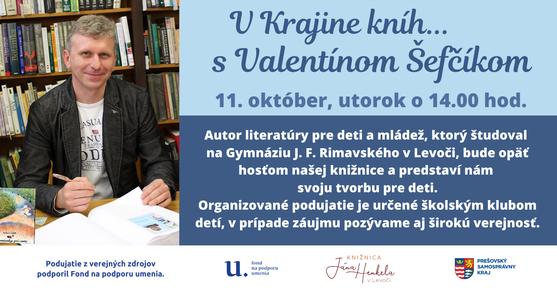 V rámci projektu Krajina kníh realizujeme besedy so slovenskými autormi kníh pre deti a mládež. V októbri nás navštívi spisovateľ Valentín Šefčík, ktorý deťom porozpráva o svojej básnickej tvorbe pre deti.