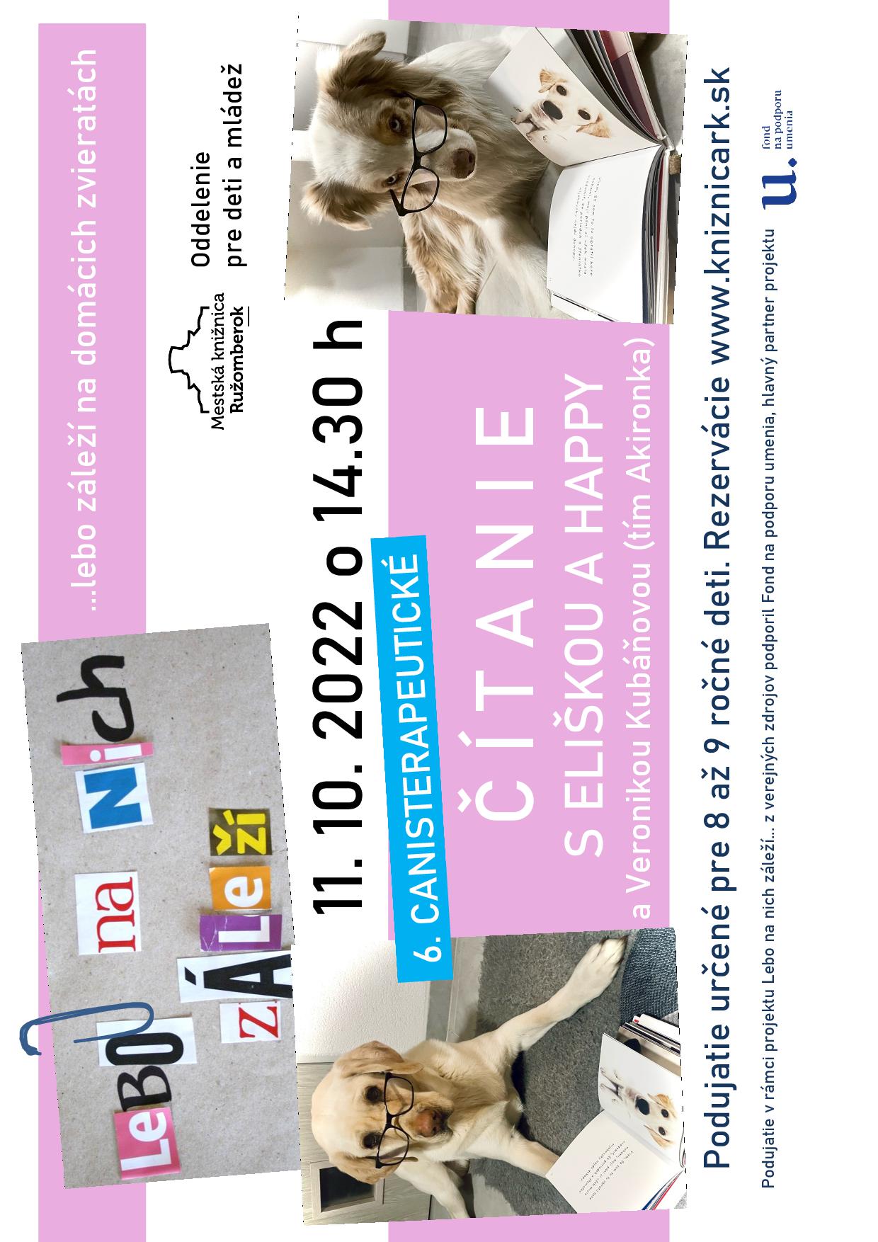 Čítanie pre deti vo veku 8 a 9 rokov v spoločnosti canisterapeutických psíkov pod vedením Veroniky Kubáňovej z tímu Akironka.
