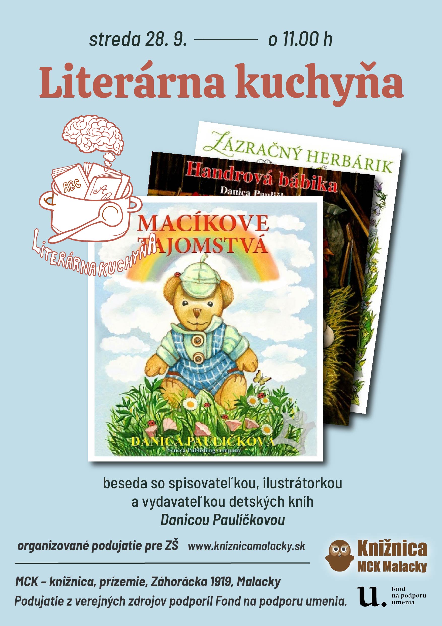 Knižnica MCK Malacky namieša vo svojej jesennej Literárnej kuchyni výchovno-vzdelávaciu kašu, ktorá podporuje čitateľskú gramotnosť, čiže trávenie kníh u detí a mládeže a ich záujem o literatúru. Pripravili sme pre žiakov organizované stretnutie so zaujímavou kuchárkou, ktorá má niečo spoločné s varením knižiek. Je to spisovateľka a najmä ilustrátorka a vydavateľka detských kníh Danica Pauličková. Je známa svojimi ilustráciami rozprávok.