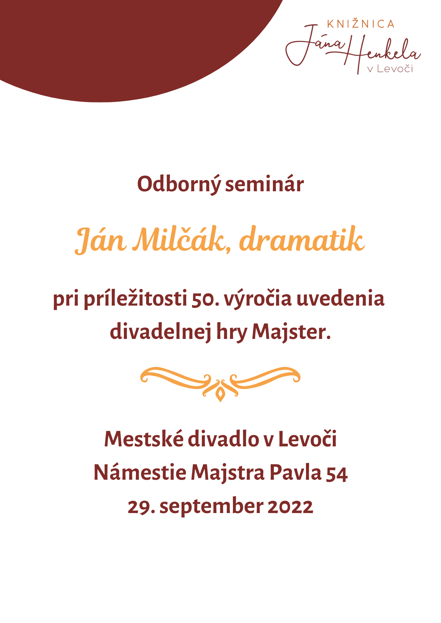 Srdečne vás pozývame na odborný seminár Ján Milčák, dramatik, ktorý sa uskutoční pri príležitosti 50. výročia uvedenia divadelnej hry Majster. Seminár sa uskutoční 29. septembra 2022 v Mestskom divadle v Levoči.