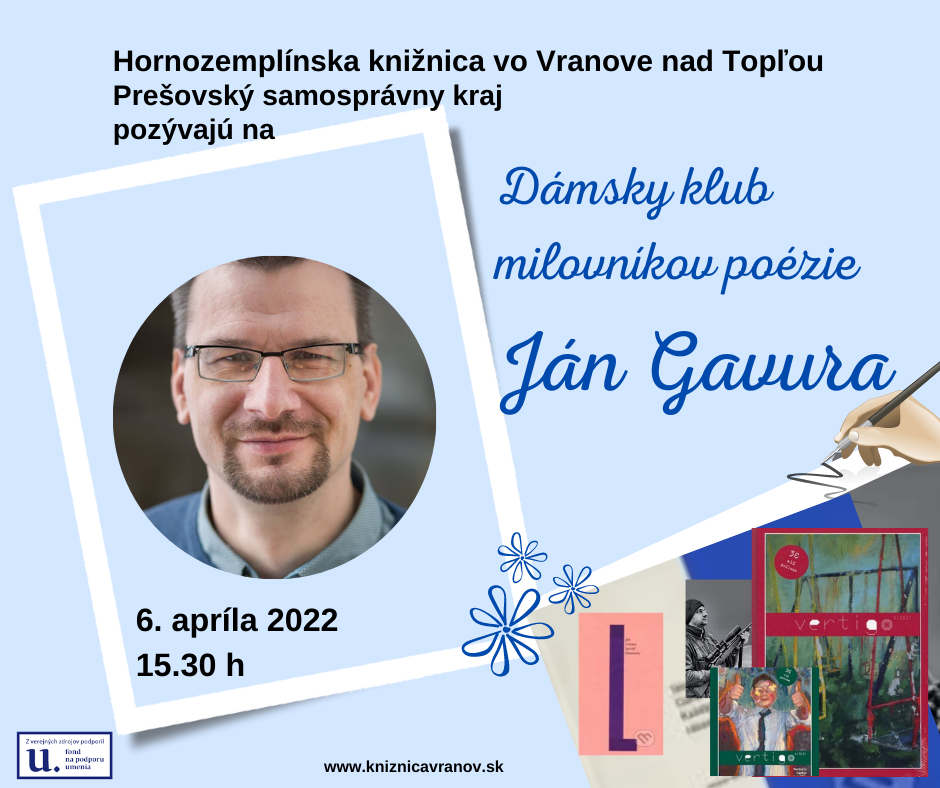 Hornoozemplínska knižnica vo Vranove nad Topľou a Prešovský samosprávny kraj Vás v rácmi projektu Poézia - dotyk - príťažlivosť pozývajú na stretnutie s básnikom Jánom Gavurom. 6.4.2022 v knižnici.