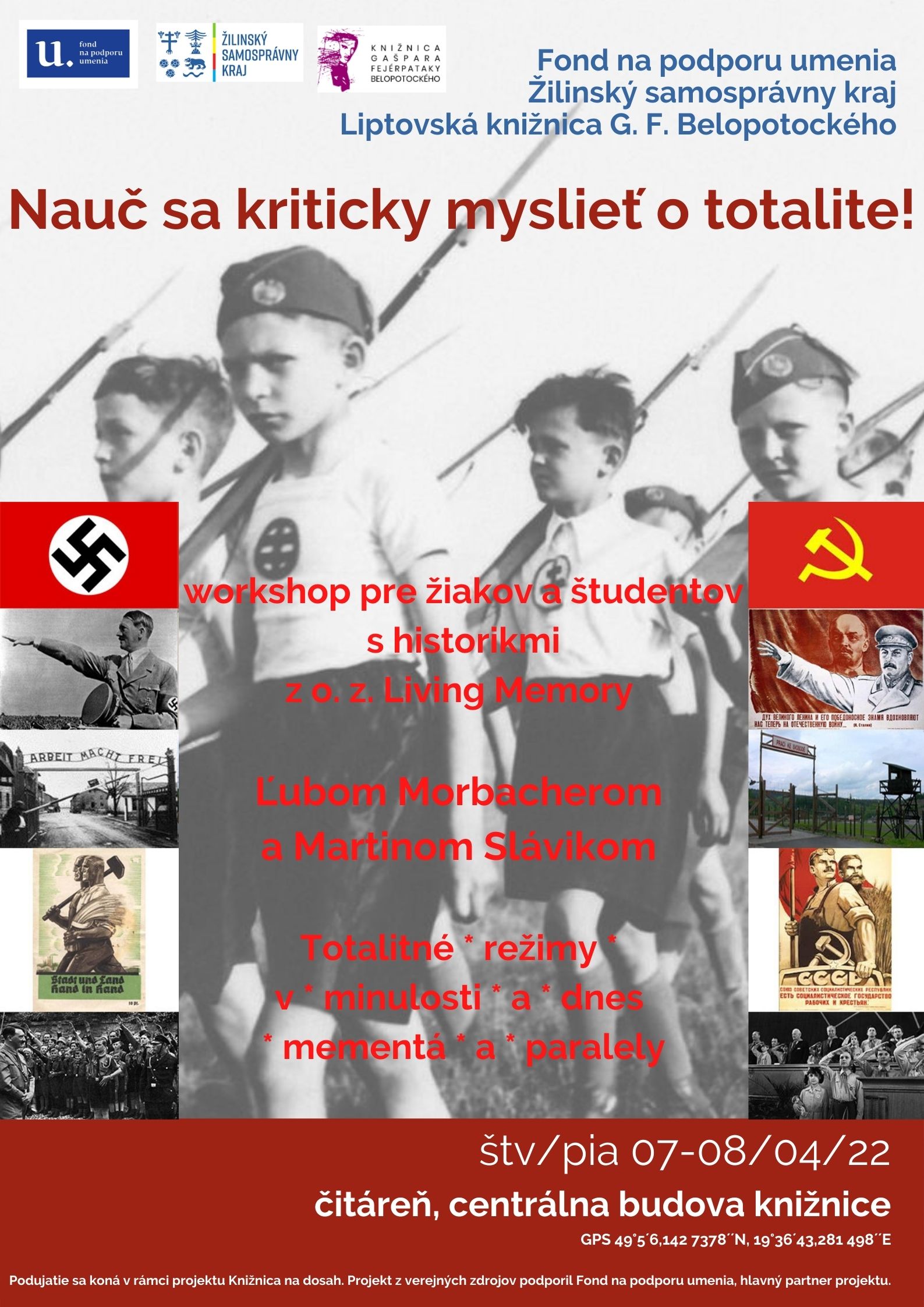 Nauč sa kriticky myslieť o totalite! Workshopy pre žiakov 9. ročníkov ZŠ a študentov SŠ s historikmi z OZ Living Memory Ľubom Morbacherom a Martinom Slávikom, 7. – 8. apríl 2022 od 9,00 hod.