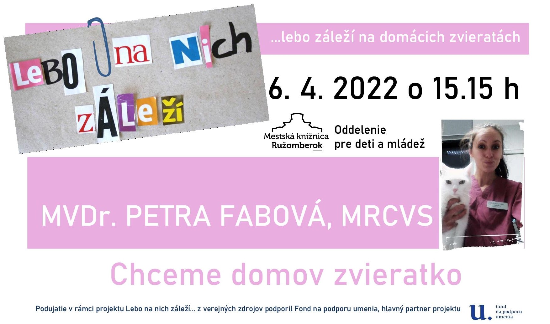 Náučné stretnutie pre deti s veterinárkou Petrou Fabovou. Zvažujete kúpu domáceho miláčika? Aké zvieratko je vhodné do bytu? Na čo sa zamerať pri výbere? Záleží na rase, alebo vyberáme podľa toho aké zvieratká sa nám páčia? Čo všetko je potrebné pripraviť k príchodu zvieratka do rodiny? Ako so zvieratkami zaobchádzať a ako im nespôsobovať zbytočnú bolesť? Ak nad kúpou zvieratka uvažujete a chcete sa rozhodnúť zodpovedne, "naša" pani veterinárka vám rada zodpovie na otázky.