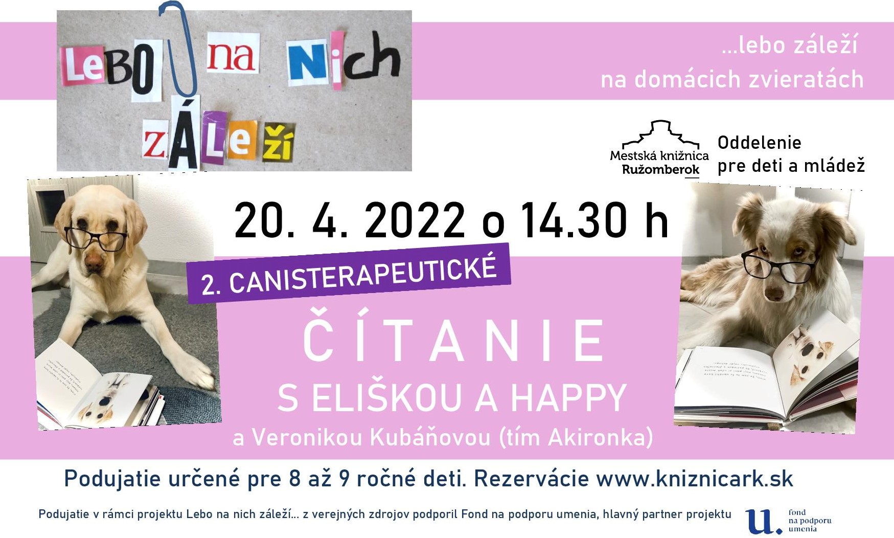 Čítanie so psíkmi Eliškou a Happy pod vedením canisterapeutky Veroniky Kubáňovej (www.akironka.sk). Stretnutie tentokrát venujeme obľúbeným knižkám, preto si deti môžu priniesť na čítanie tú svoju "naj."
