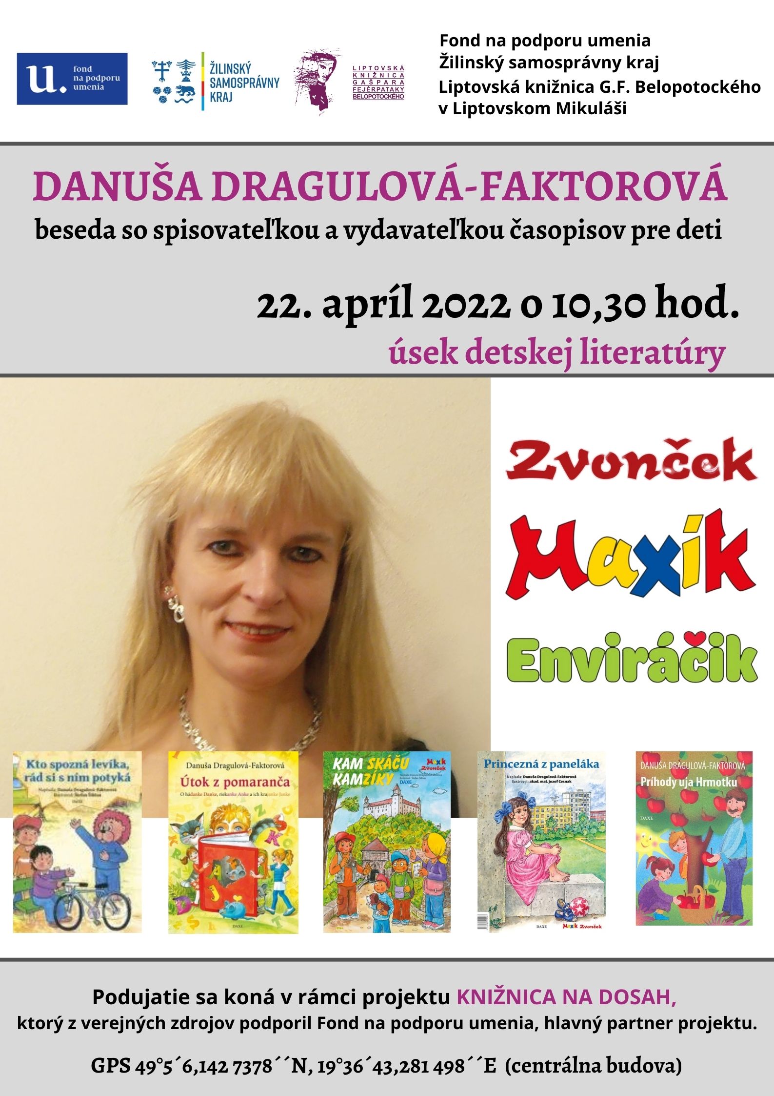 Danuša Dragulová-Faktorová – autorská beseda pre deti; 22. apríl 2022 od 10,30 hod.; úsek detskej literatúry