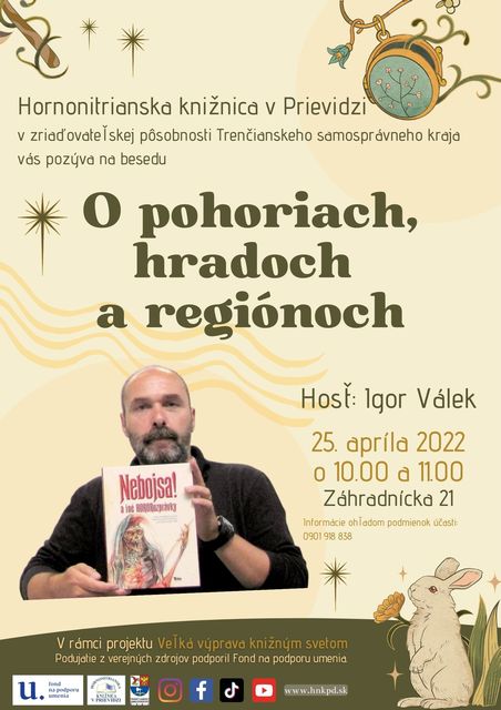V posledný aprílový pondelok 25. 4. 2022 o 10.00 a 11.00 hod. priblíži súčasný autor Igor Válek povesť ako špecifický žáner ľudovej slovesnosti. Strávime s ním nielen príjemne hrôzostrašné chvíle pri rozhovore o našich hradoch, pohoriach a ich tajomných "obyvateľoch", ale aj o písaní a charakteristických črtách tohto žánru.
