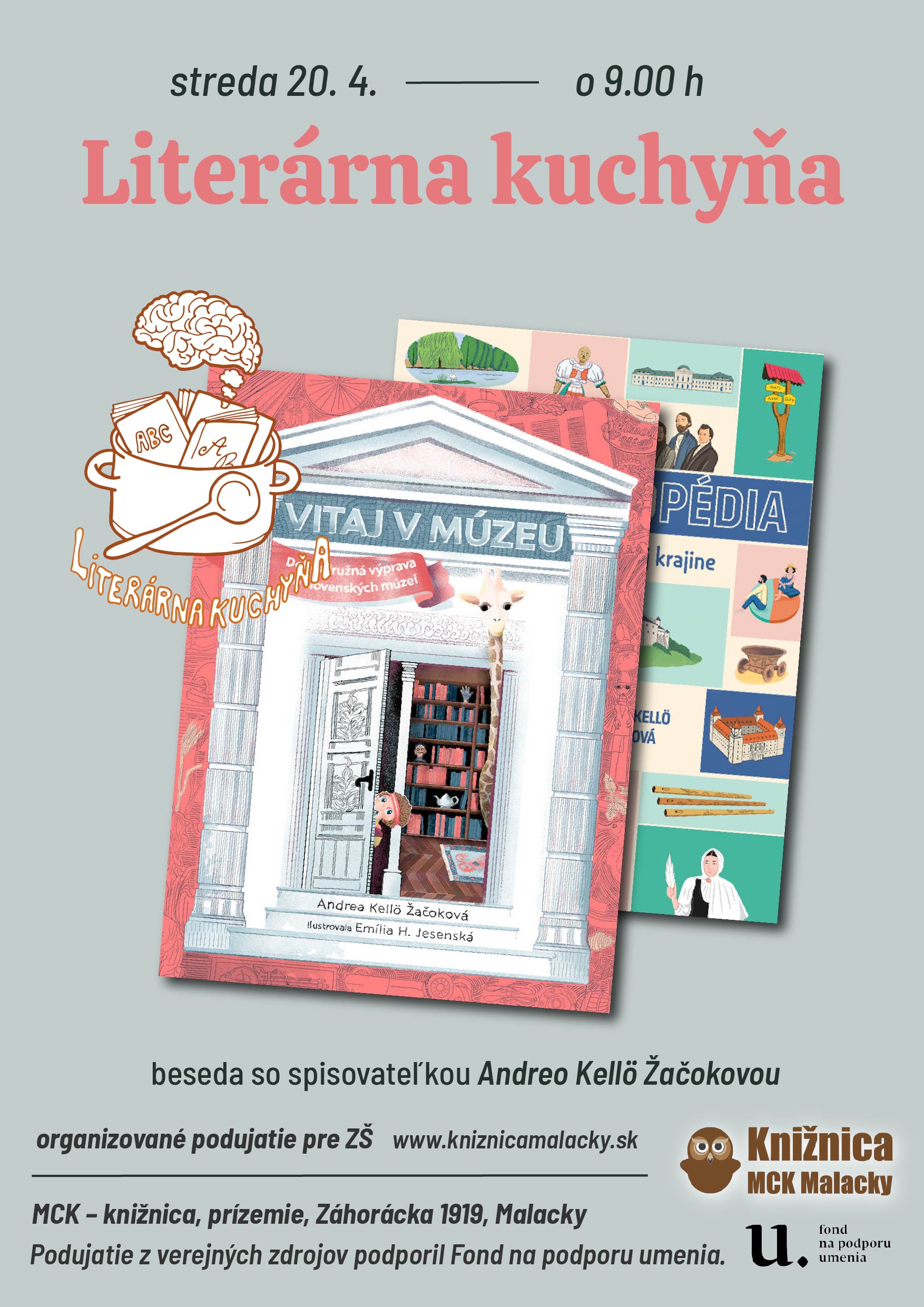Knižnica MCK Malacky v Literárnej kuchyni namieša druhú výchovno-vzdelávaciu kašu, ktorá podporuje čitateľskú gramotnosť, čiže trávenie kníh u detí a mládeže a ich záujem o literatúru. Pripravili sme pre žiakov organizované stretnutie so spisovateľkou Andreou Kellö Žačokovou a jej prezentáciu populárno-náučných kníh pre deti a mládež Vitaj v múzeu a Slovenskopédia: zaujímavosti o našej krajine. Projekt Literárna kuchyňa je zameraná na rozvoj a podporu čitateľskej gramotnosti detí a mládeže.