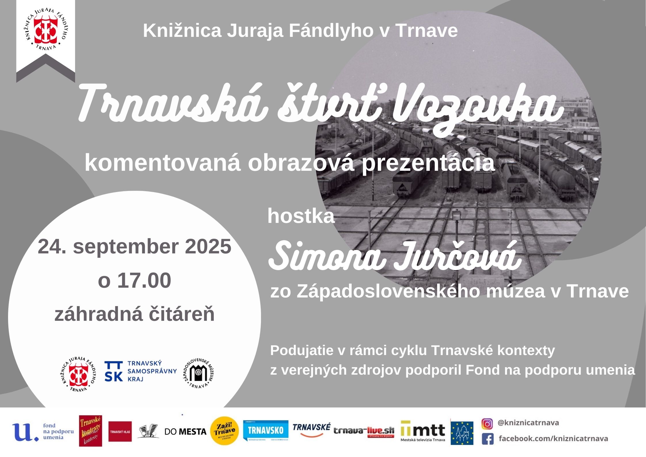 Simona Jurčová patrí k obľúbeným hostkám v našej knižnici. Prijmite pozvanie na rozprávanie o trnavskej štvrti Vozovka, ktorá vznikala od 20. rokoch 20. storočia v súvislosti so vznikom závodu na opravu železničných vagónov. Vedeli, ste, že práve pri Vozovke vznikol Robotnícky spevokol Bradlan, ktorý v tomto roku oslávil 95. výročie svojho vzniku? Aj takéto informácie sa môžete dozvedieť z komentovanej obrazovej prezentácie v záhradnej čitárni knižnice.