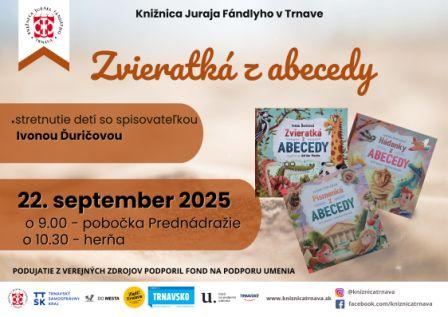 Známa autorská dvojica Ivona Ďuričová a Adrián Macho sa chystá znovu rozveseliť našich najmenších čitateľov – knižkou Zvieratká z abecedy. Spisovateľka Ivona Ďuričová zoznámi deti s pruhovanou zebrou, s barančekom Neposedkom aj so žirafiačikom, čo ľúbi čokoládu, s pandami fešandami, so zatúlaným sloníkom a s inými zvieratkami. Na konci knižky sa všetky zvieratká ukryli do hádaniek. Kto v nich zvieratká objaví, bude dobrý kamarát aj s ABECEDOU.