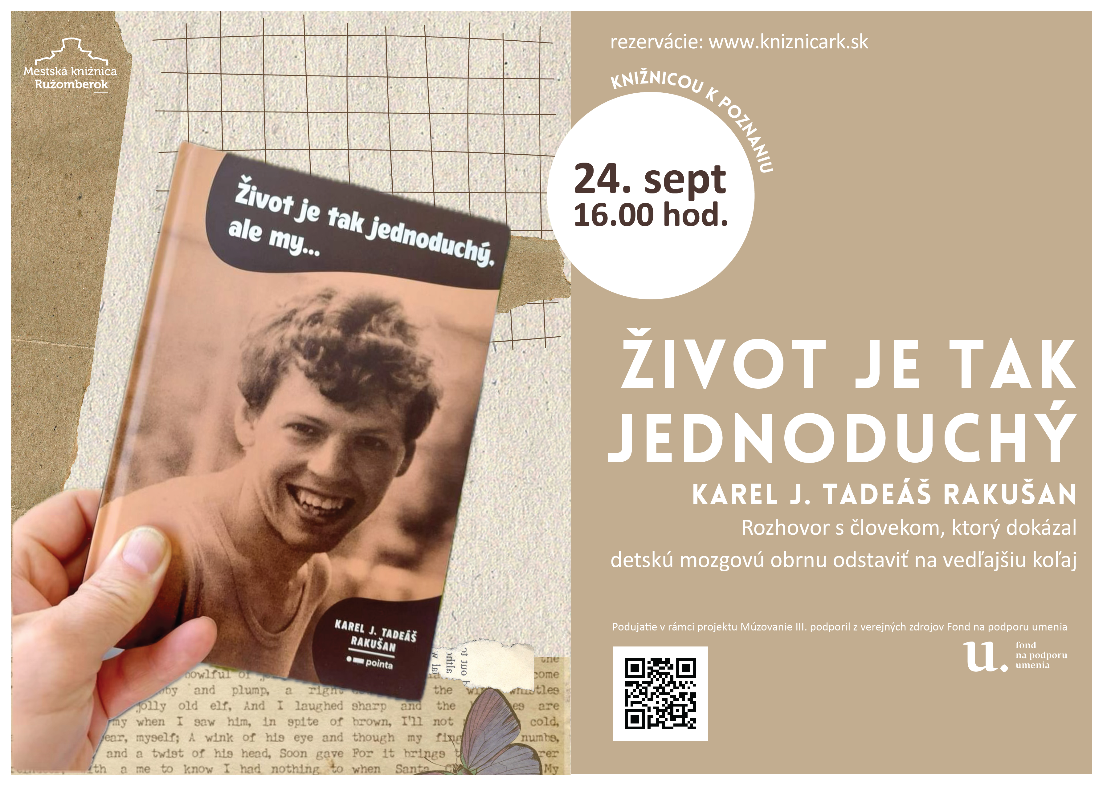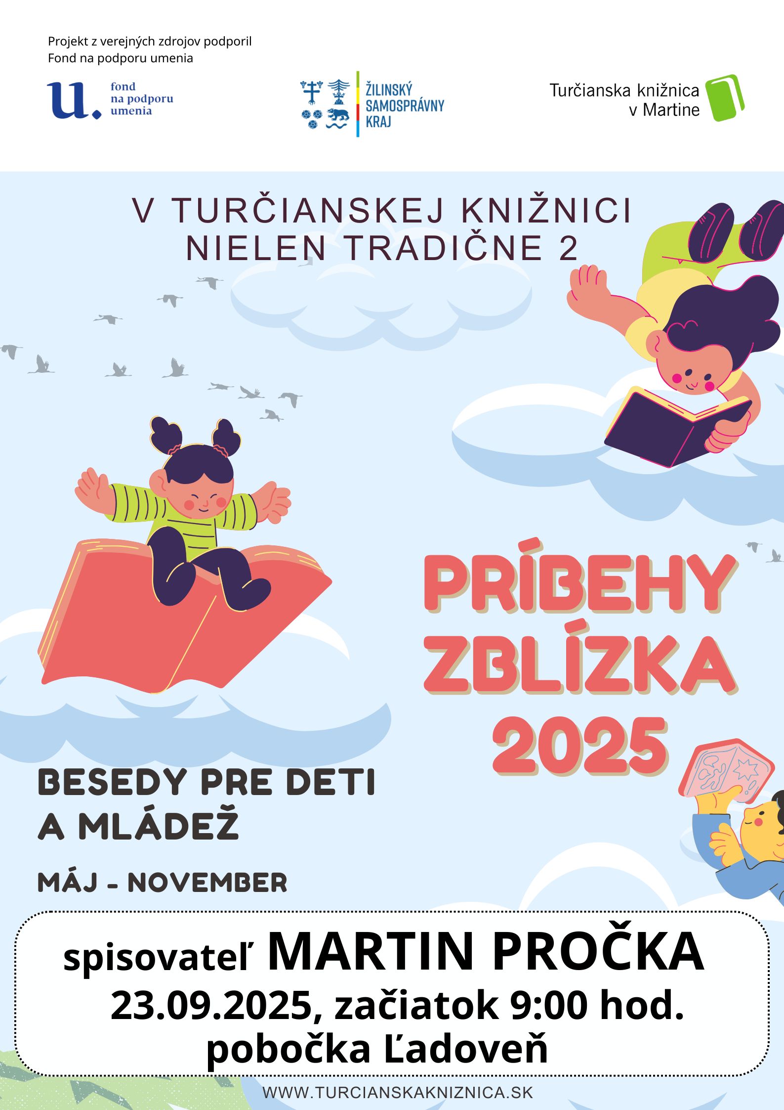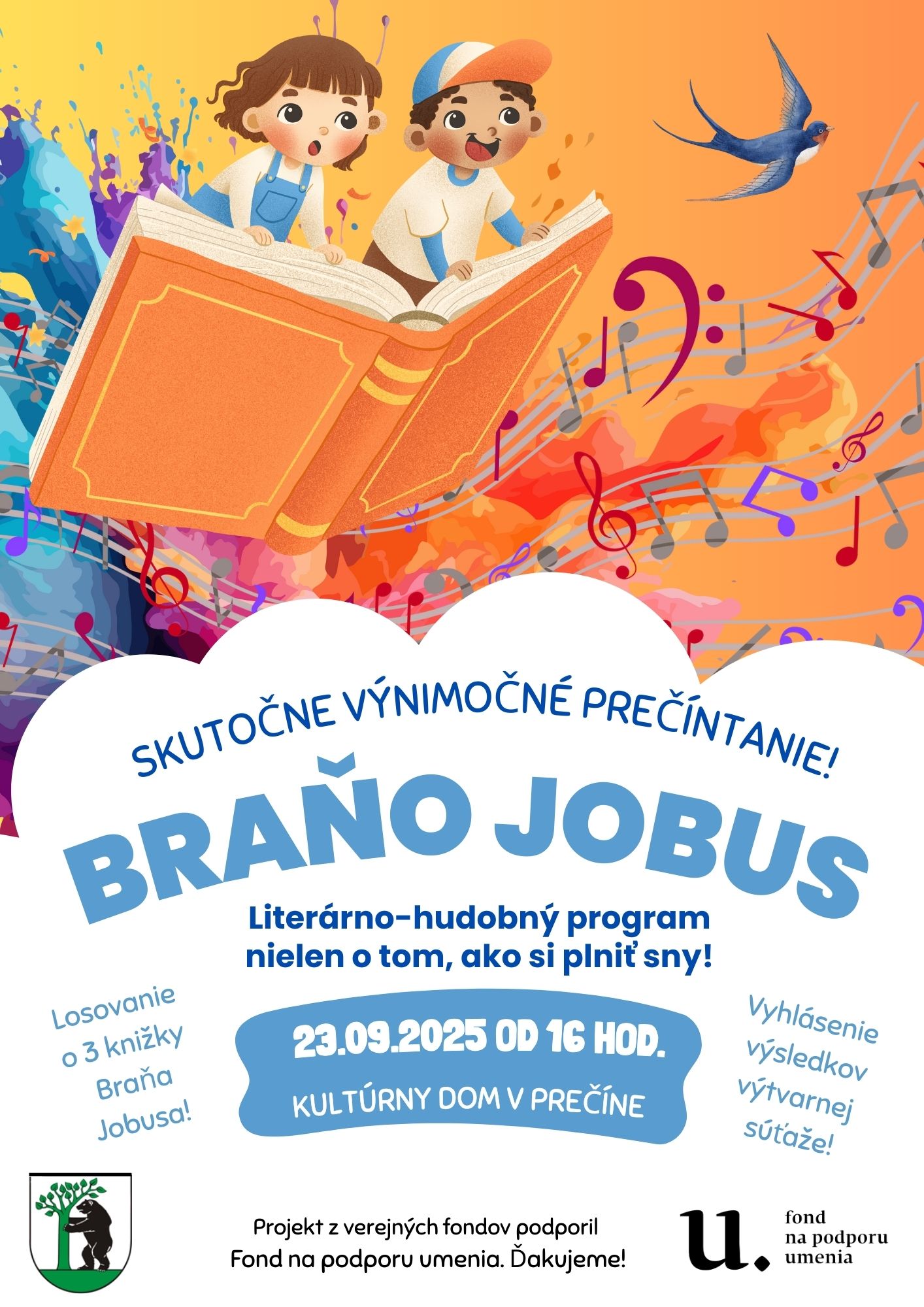 Milé knihomoľčatá, srdečne Vás pozývame na mimoriadne výnimočnú časť „preČÍnTAČIEK“, ktorá sa uskutoční dňa 23.09.2025 od 16 hod. v Kultúrnom dome v Prečíne. Navštívi vás neopakovateľný spevák, hudobník, spisovateľ a herec Braňo Jobus, ktorý vám bude hrať, čítať a rozprávať sa s vami o všetkom možnom aj nemožnom! Okrem veľkej zábavy na vás čaká aj losovanie o 3 krásne Braňove knižky. Celý projekt „preČÍnTANIE“ realizujeme vďaka podpore Fondu na podporu umenia. Ďakujeme.