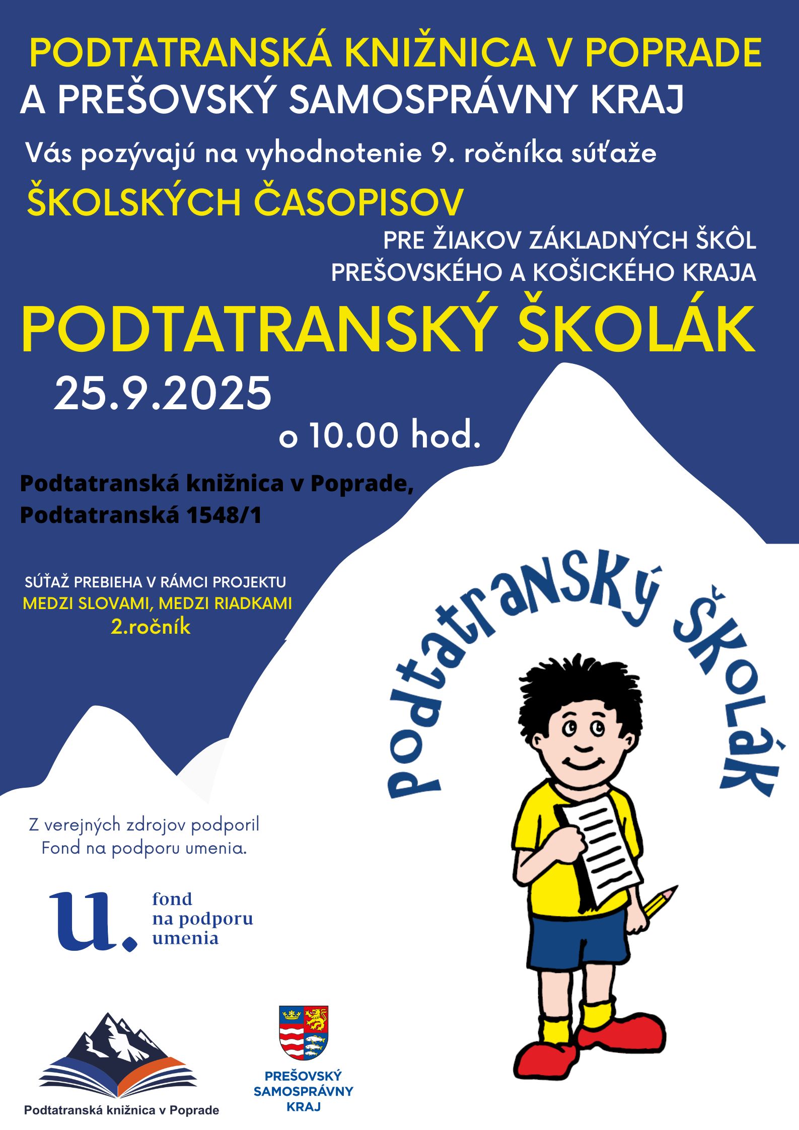 V rámci 9.ročníka súťaže školských časopisov základných škôl Prešovského a Košického samosprávneho kraja Podtatranský školák, realizujeme vyhodnotenie súťaže odbornou porotou v zložení Mgr. Daša Jeleňová, hovorkyňa Prešovského samosprávneho kraja a predsedníčka poroty; Mgr. Mária Frisová, redaktorka SITA a Mgr. Ingrid Janigová, bývalá šéfredaktorka Tatranského dvojtýždenníka. Podujatie je súčasťou projektu Medzi slovami, medzi riadkami- 2. ročník.
