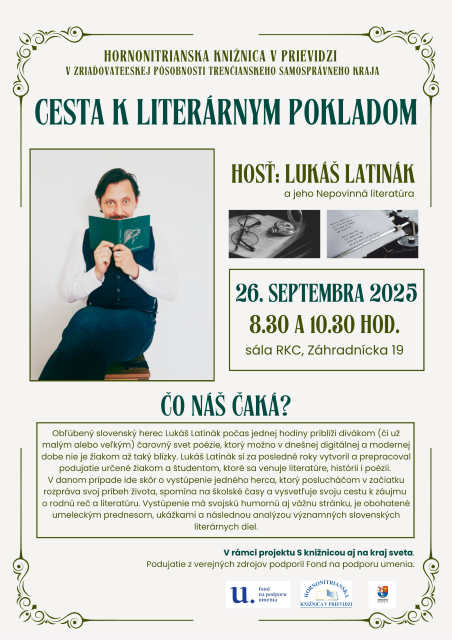 Hornonitrianska knižnica v Prievidzi chce pomôcť žiakom a študentom objaviť klasické diela povinného čítania z úplne novej perspektívy. Hlavným sprievodcom na tejto ceste bude známy herec Lukáš Latinák, ktorý sa (ne)povinnej literatúre venuje naozaj do hĺbky. Jeho vystúpenie má svojskú humornú aj vážnu stránku, je obohatené umeleckým prednesom, ukážkami a následnou analýzou významných slovenských literárnych diel.