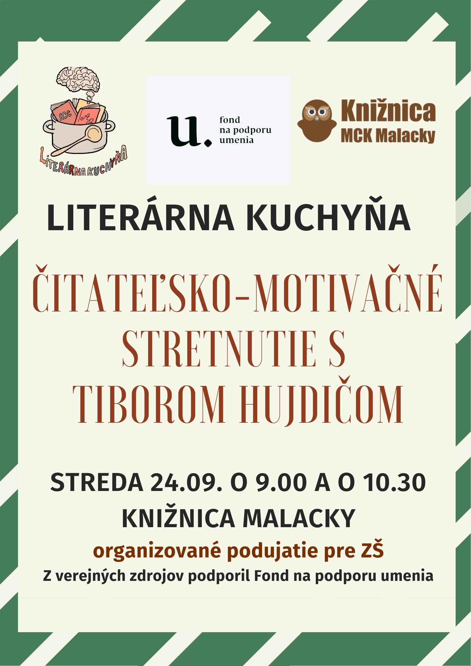 Knižnica MCK Malacky v Literárnej kuchyni namieša tretiu výchovno-vzdelávaciu kašu, ktorá podporuje čitateľskú gramotnosť, čiže trávenie kníh u detí a mládeže a ich záujem o literatúru. Pripravili sme pre žiakov organizované stretnutie s Tiborom Hujdičom - čitateľským motivátorom Knihy pre deti najprv testuje sám na sebe a až keď si je istý, že sú dobré, šíri o nich zvesť medzi deťmi, rodičmi, učiteľmi a knihovníkmi. Je jedným z tých, ktorí hľadajú cesty, ako priviesť deti k čítaniu.