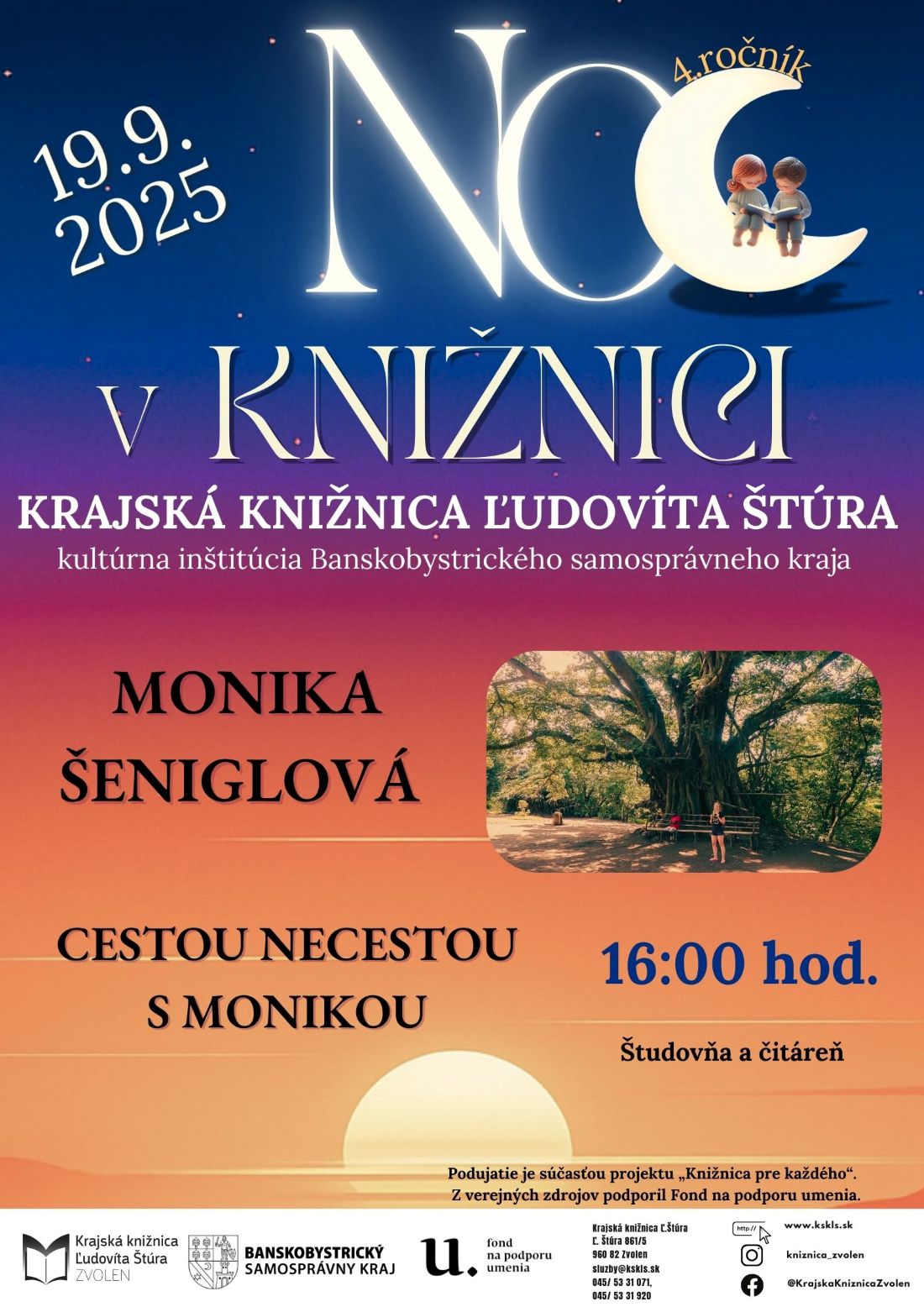 Krajská knižnica Ľudovíta Štúra pripravila v piatok 19. septembra 2025 pre svojich návštevníkov 4. ročník podujatia Noc v knižnici, ktorého cieľom je prezentovať knižnice ako miesta stretávania sa jednotlivcov a rôznorodých komunít. V popoludňajších a večerných hodinách je pre deti i dospelých pripravený bohatý program. V rámci podujatia vás pozývame na stretnutie s cestovateľkou Monikou Šeniglovou.