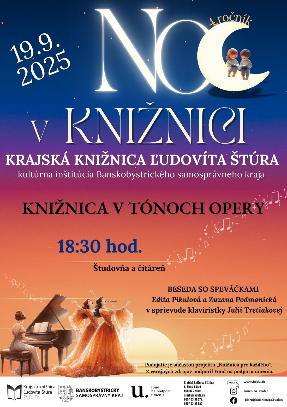 Krajská knižnica Ľudovíta Štúra pripravila v piatok 19. septembra 2025 pre svojich návštevníkov 4. ročník podujatia Noc v knižnici, ktorého cieľom je prezentovať knižnice ako miesta stretávania sa jednotlivcov a rôznorodých komunít. V popoludňajších a večerných hodinách je pre deti i dospelých pripravený bohatý program. V rámci podujatia vás pozývame na besedu s opernými speváčkami Editou Pikulovou a Zuzanou Podmanickou spojenú so speváckymi ukážkami v sprievode klaviristky Júlii Tretiakovej.
