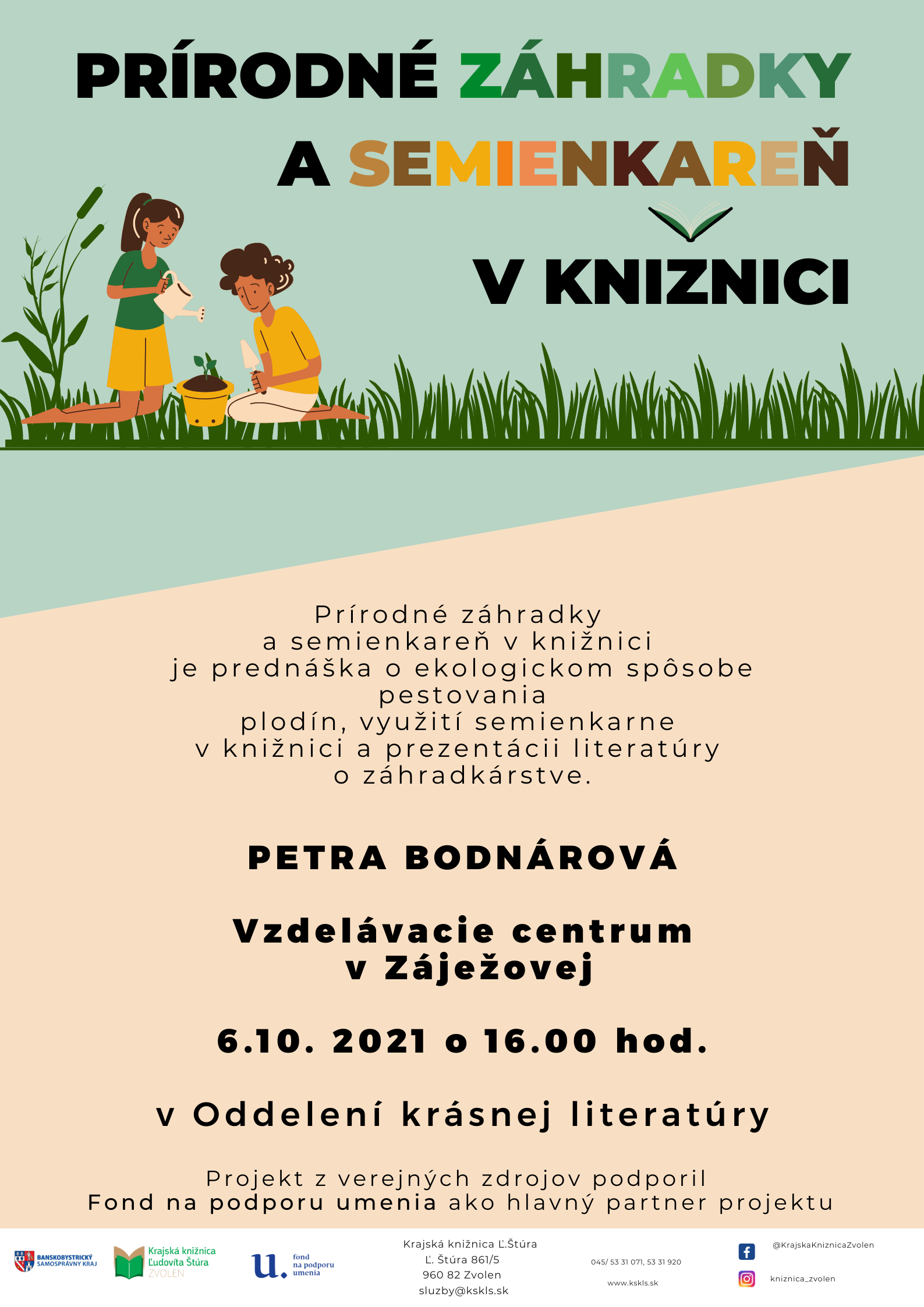 Prednáška o prírodných záhradách a využití semienok z rastlín dopestovaných vo vlastnej záhradke. Lektorkou je Petra Bodnárová zo vzdelávacieho centra v Zajažovej. V krajskej knižnici je už niekoľko rokov zriadená verejná semienkareň, ktorá slúži záujemcom o bezplatnú výmenu semienok. Originálna myšlienka, ktorá má ľudí priviesť k ekologickejšiemu spôsobu života. Ďalšou ideou podujatia je propagovať semienkareň v knižnici.