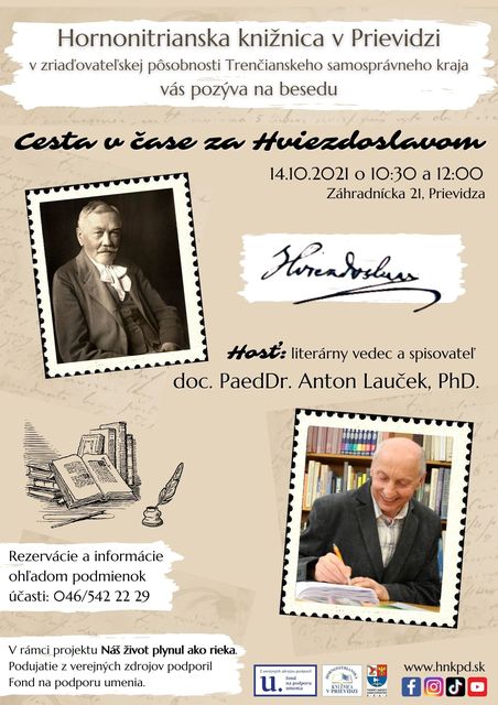 Termín "Hviezdoslavov Kubín" pozná takmer každý. To, že Pavol Országh Hviezdoslav bol jeden z najvýznamnejších slovenských básnikov je nám tiež určite známe. Poznáte ale inšpiratívny životný príbeh tohto slovenského velikána s typickou mašľou na krku? Hviezdoslavov zaujímavý život a tvorbu nám poodkryje 14.10. 2021 o 10.30 a 12.00 v Hornonitrianskaj knižnici v Prievidzi literárny vedec a spisovateľ doc. PaedDr. Anton Lauček, PhD.