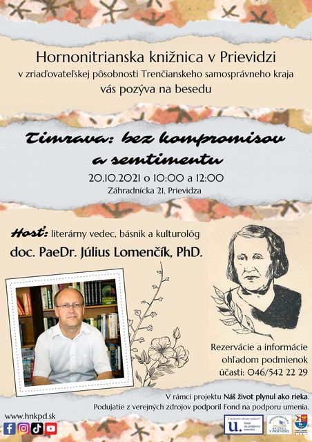 Životné osudy, ktoré ovplyvnili literárne smerovanie jednej z najznámejších slovenských spisovateliek Boženy Slančíkovej Timravy príde sprostredkovať 20.10.2021 o 10.00 a 12.00 hod. literárny vedec, básnik a kulturológ doc. PaeDr. Július Lomenčík, PhD. do Hornonitrianskej knižnice v Prievidzi.