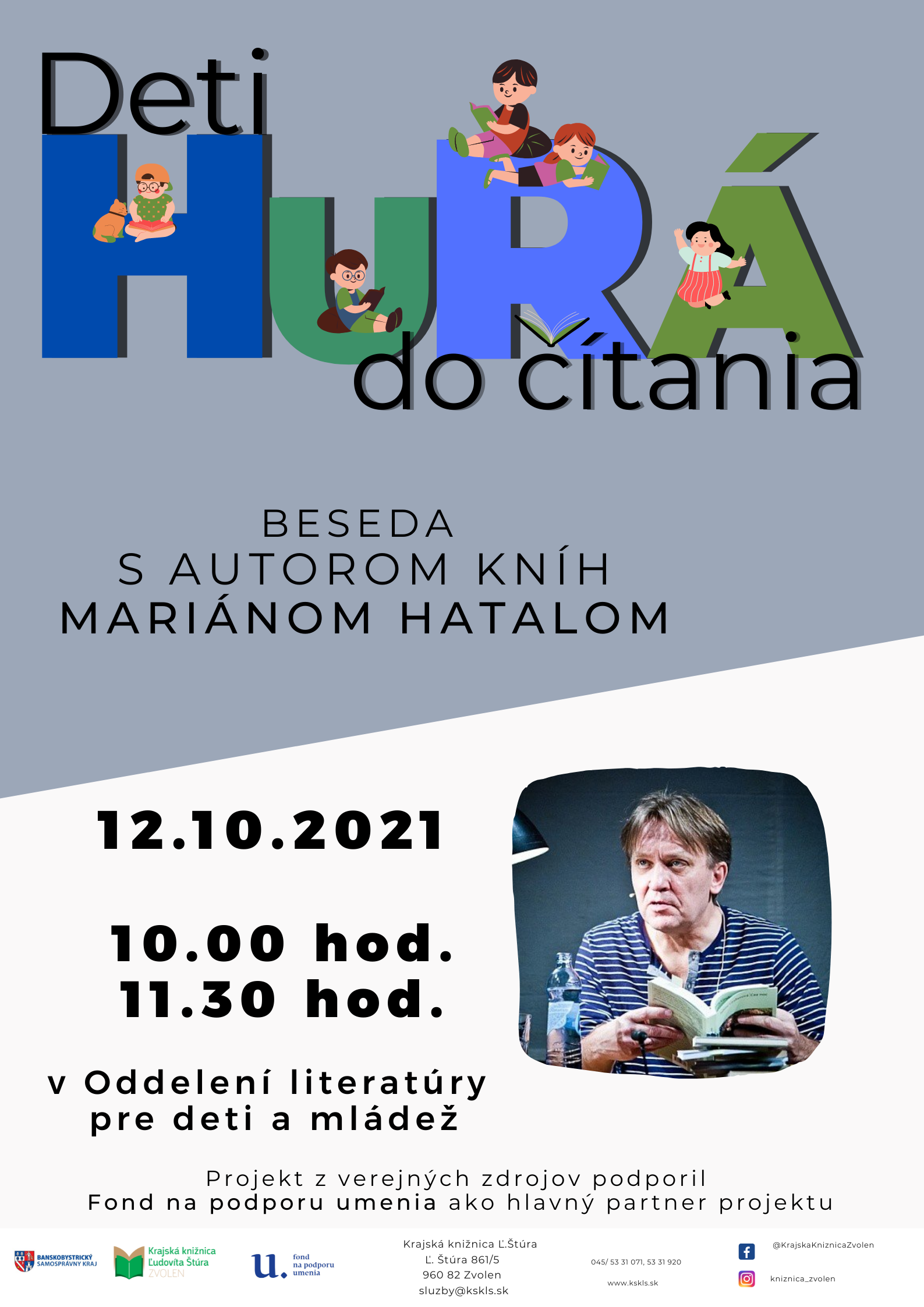 Beseda určená žiakom základných škôl, v ktorej sa stretnú a budú besedovať so spisovateľom Mariánom Hatalom. Marián Hatala (Holíč, 1958) študoval germanistiku a slavistiku. Do oblasti jeho tvorby patrí literatúra pre deti a mládež, poézia, recenzistika, publicistika a preklady z poézie a prózy písanej po nemecky. Žije v Bratislave. Knihy pre deti vo fonde krajskej knižnice: Doučko s futbalom (2021) Spoveď záškoláka (2014) Kratochvíle pre väčšie deti a menších dospelých (2010)