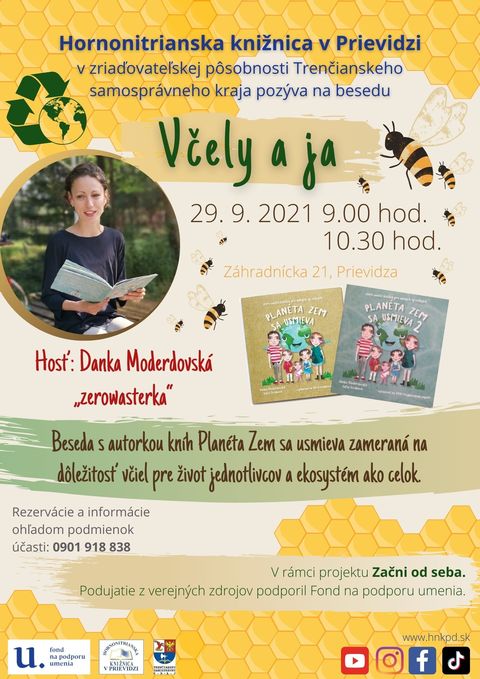 Cieľom projektu "Začni od seba" je posilniť environmentálne vedomie u žiakov ZŠ a SŠ a prehĺbiť už získané vedomosti z oblasti ochrany prírody prostredníctvom interaktívnych prednášok s odborníkmi z danej oblasti. Dve besedy pod názvom "Včely a ja" v stredu 29.9.2021 o 9.00 a 10.30 hod. s Dankou Moderdovskou (autorkou kníh Planéta Zem sa usmieva) nenechajú nikoho na pochybách, že včely sú dôležitým faktorom pre život jednotlivca i ekosystém.