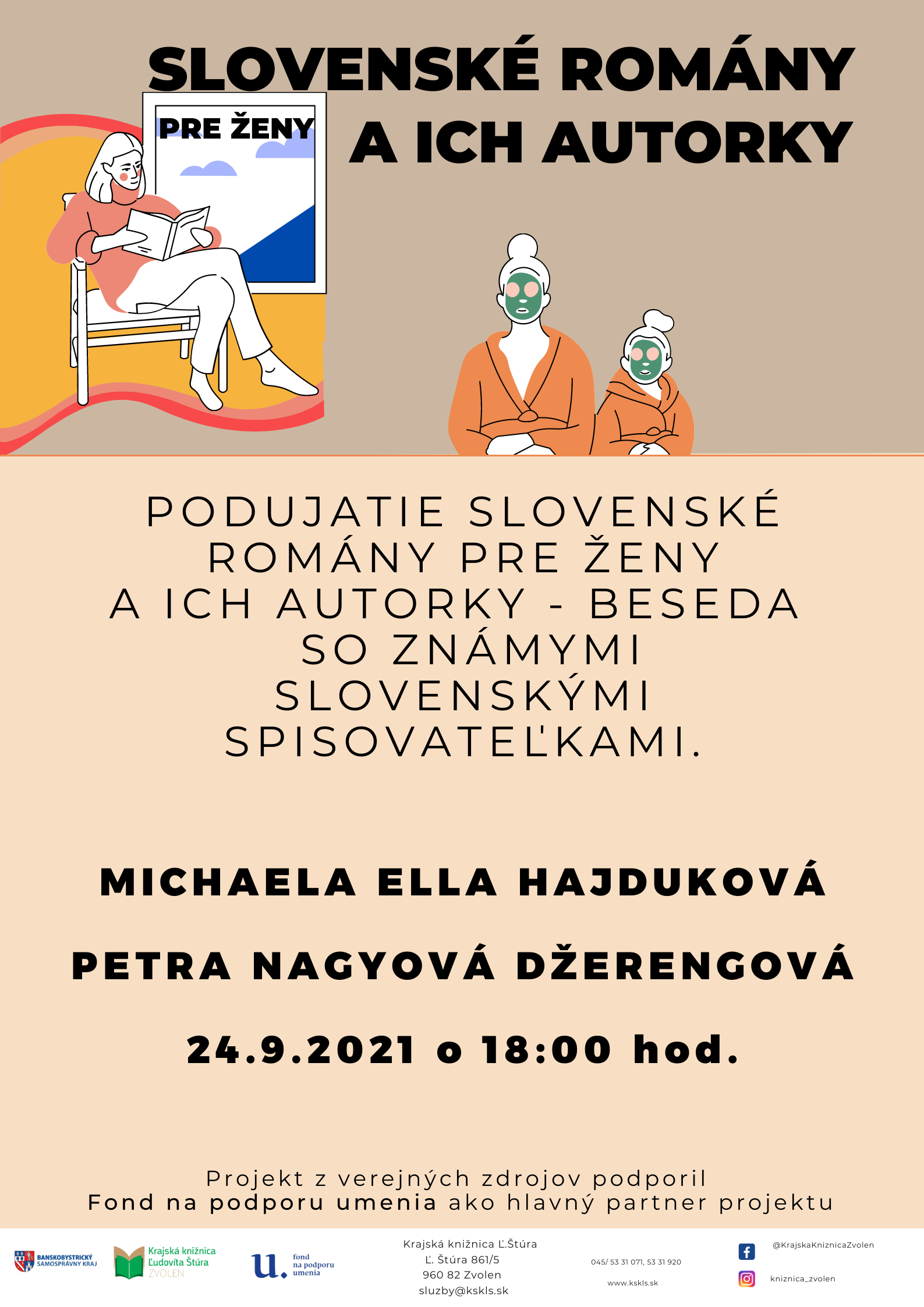 Beseda, ktorej cieľom je podpora čítania a propagácia slovenských autoriek románov, ktorých čitateľkami sú najmä ženy. Literatúra tohto druhu môže plniť nie len relaxačnú funkciu, ale aj terapeutickú. Besedovať budú Petra Nagyová Džerengová a Michaela Ella Hajduková, ktorých knihy sú čitateľsky mimoriadne obľúbené a v knižnici patria medzi najpožičiavanejšie.