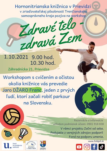 Ako spolu súvisí zdravé telo, zdravá knižnica, zdravá planéta? Náš lektor, parkourista Jaro "Džaro" Franc si 1. októbra s malými čitateľmi najprv zacvičí pre zdravé telo, potom spoločne vyzbierame odpadky z okolia našej knižnice pre zdravú planétu. Na záver deťom odporučíme knihy s tematikou športu, zdravého životného štýlu a ochrany životného prostredia.