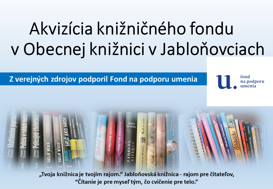 Obecná knižnica Jabloňovce získala v roku 2021 z verejných zdrojov Fondu na podporu umenia dotáciu na nákup knižného fondu v sume 1000 €.