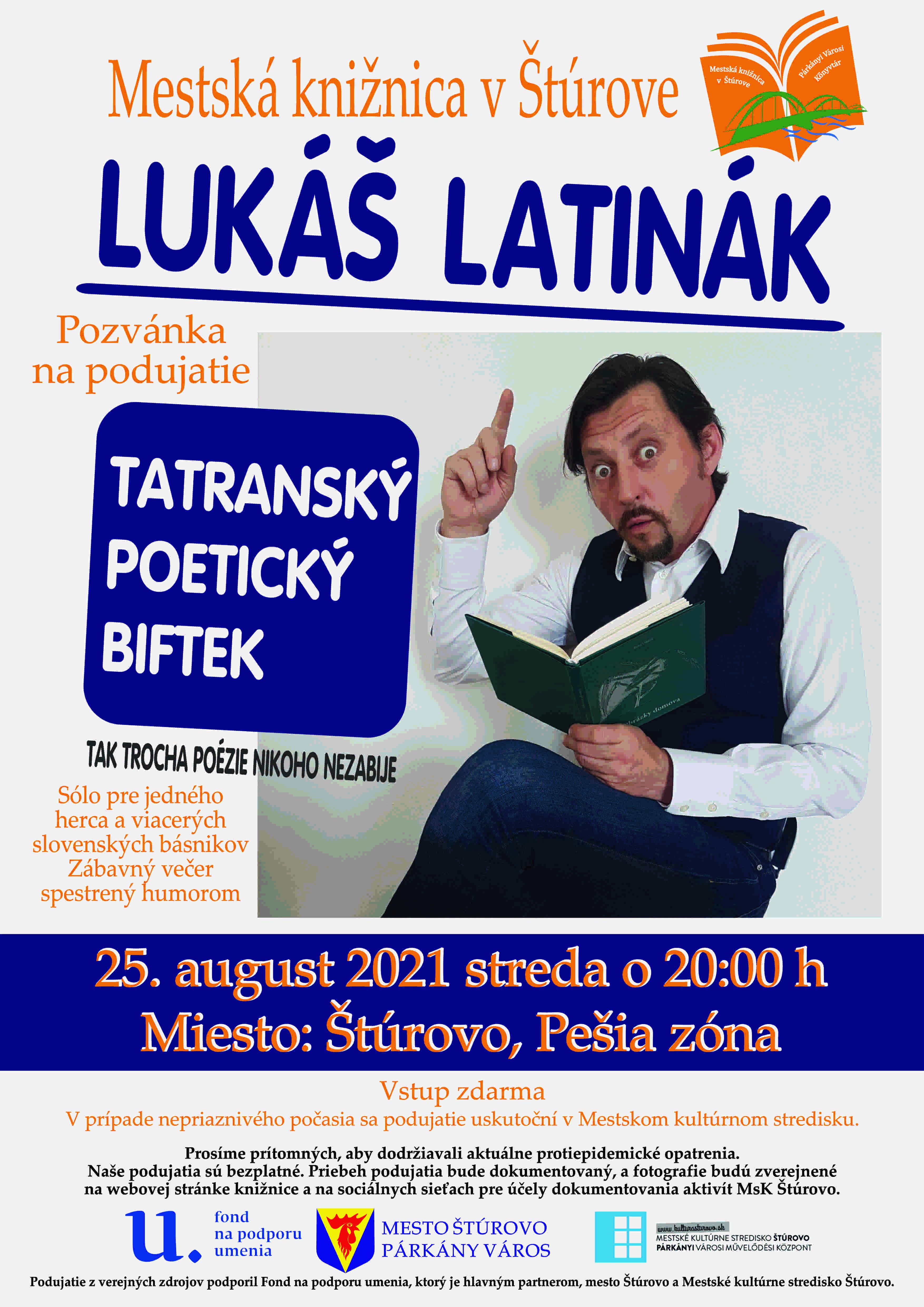 Mestská knižnica v Štúrove, Pozvánka na podujatie, Lukáš Latinák, Tatranský poetický biftek, Tak trocha poézie nikoho nezabije Sólo pre jedného herca a viacerých slovenských básnikov, Zábavný večer spestrený humorom. Dňa 25. augusta 2021 streda o 20:00 h, Miesto: Štúrovo, Pešia zóna, vstup zdarma. Podujatie z verejných zdrojov podporil Fond na podporu umenia, ktorý je hlavným partnerom, mesto Štúrovo a Mestské kultúrne stredisko Štúrovo.