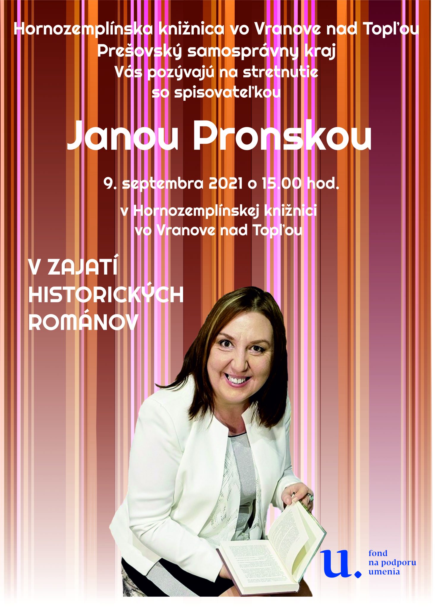 Hornozemplínska knižnica vo Vranove nad Topľou a Prešovský samosprávny kraj Vás srdečne pozývajú na besedu s Janou Pronskou, slovenskou autorkou historických romancí, ktorá si získala srdcia niekoľkých čitateliek. Stretnutie sa uskutoční 9. septembra o 15.00 hod. v Hornozemplínskej knižnici vo Vranove nad Topľou.