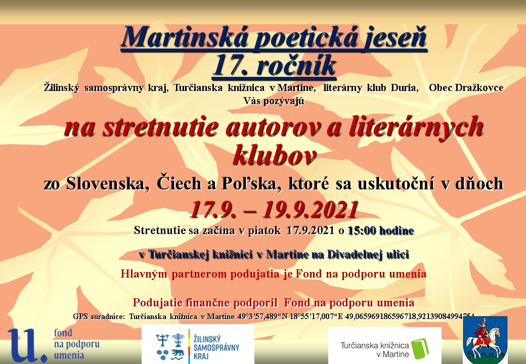 Stretnutie literárnych klubov a spolkov zo Slovenska, Česka, Poľska s prezentáciou literárnej tvorby zúčastnených autorov, prezentáciou vydavateľských úspechov za obdobie od poslednej Martinskej poetickej jesene a s výmenou skúseností z činnosti jednotlivých literárnych klubov a spolkov.
