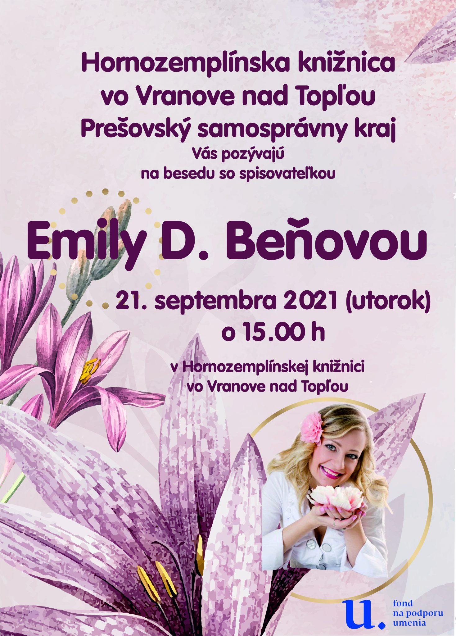 Hornozemplínska knižnica vo Vranove nad Topľou a Prešovský samosprávny kraj Vás srdečne pozývajú na besedu s Emily D. Beňovou, obľúbenou slovenskou autorkou, ktorá si získala srdcia mnohých čitateliek. Stretnutie sa uskutoční 21. septembra o 15.00 hod. v Hornozemplínskej knižnici vo Vranove nad Topľou.