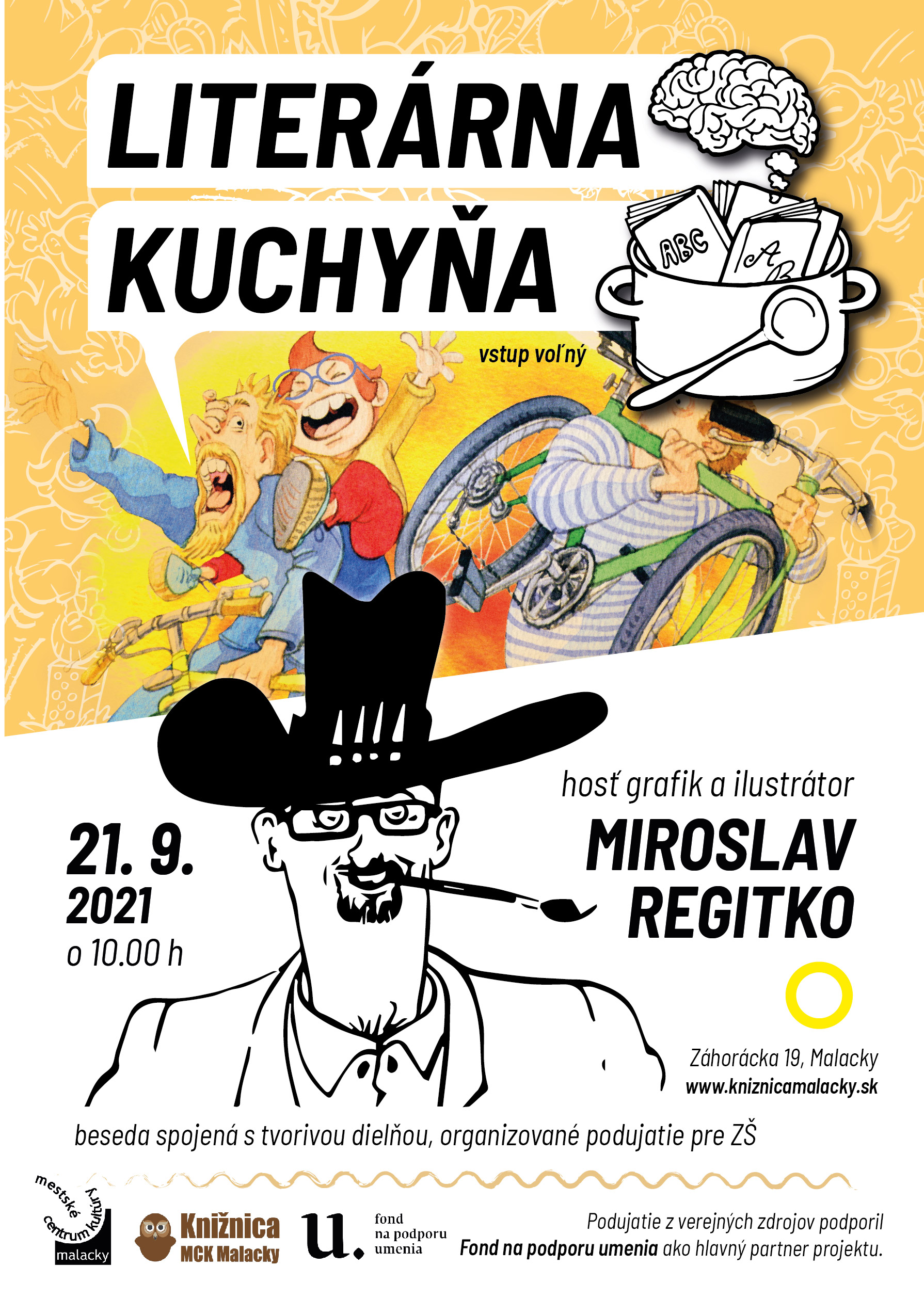 Knižnica MCK Malacky v Literárnej kuchyni namiešala prvú jesennú výchovno-vzdelávaciu kašu, ktorá podporuje čitateľskú gramotnosť, čiže trávenie kníh u detí a mládeže a ich záujem o literatúru. Pripravili sme pre žiakov organizované stretnutie s grafikom a ilustrátorom Miroslavom Regitkom. . Najznámejšie sú jeho vtipné karikatúry a ilustrácie, ktoré nájdete v detských knihách, školských učebniciach a dlhoročne aj v časopise Fifík. Podujatie je spojené s tvorivou dielňou.